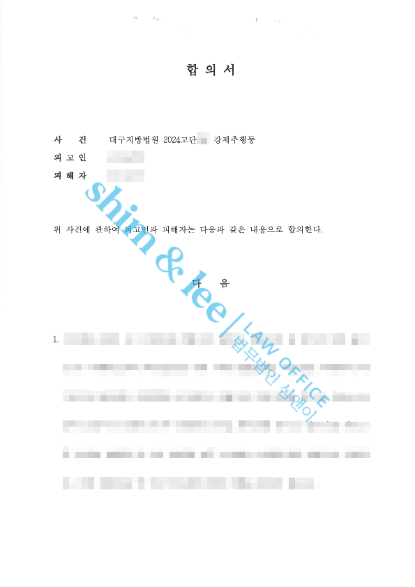 -심앤이의 노력 덕분에 압박을 느낀 가해자는 돌연 공판에서 혐의를 모두 인정하고 합의를 요청하였습니다. 합의 과정에서 가해자측은 쉽사리 금액을 올리려고 하지 않았고 아주 기본적인 내용으로만 합의서를 작성하고자 하였습니다.