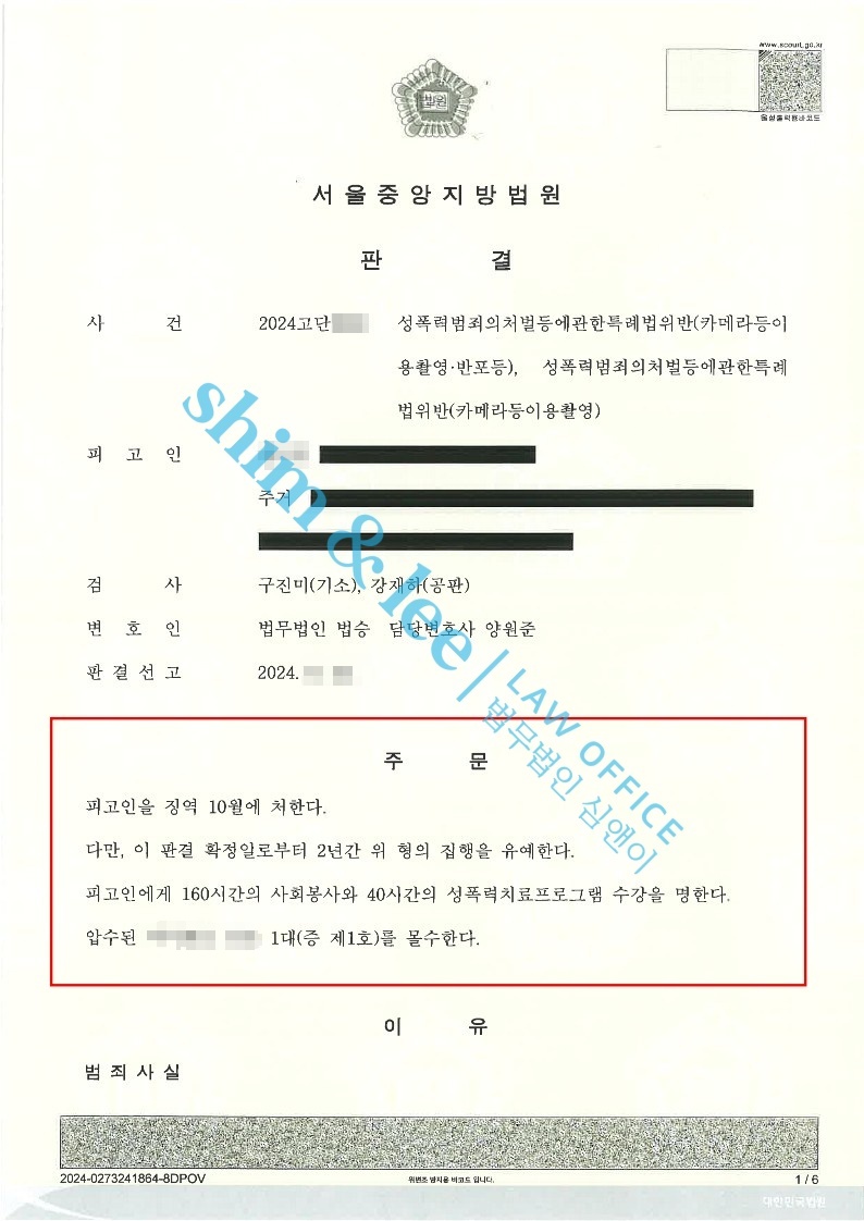 -가해자는 자신의 죄를 모두 인정하고, 피해자에게 2,500만 원의 합의금을 지급하였음에도 재판부의 엄중한 판단에 따라 징역 10월, 집행유예 2년, 사회봉사 160시간, 성폭력 치료강의 40시간 수강 명령 선고와 압수된 핸드폰을 몰수 당하는 중한 판결을 받게 되었습니다.
