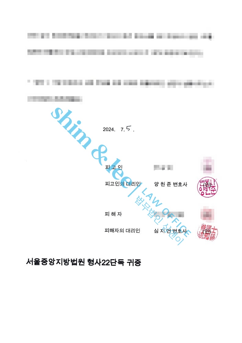대표 변호사님은 상대방 변호사와 직접 합의를 위한 소통을 진행하고 의뢰인이 만족할만한 합의금과 장래 피해 발생을 막는 예방 조항과 유포금지 조항까지 만들어내기 위해 노력하였습니다. 피해자는 자신의 올바른 성개념이 부족한 점을 인정하며 합의금 2,500만 원을 지급하고 피해자가 제시한 부대 합의 조건에 동의하였습니다. -