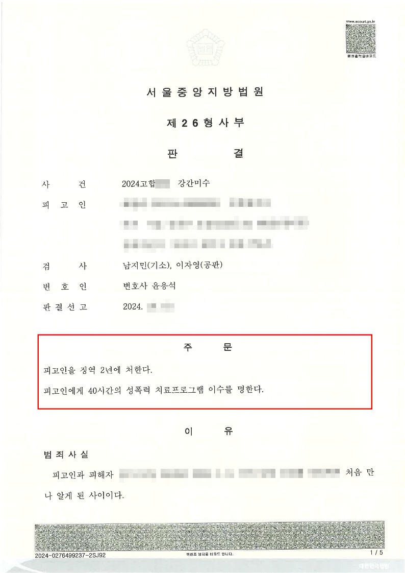 - 재판부에서는 피해자 사건 이후 상당한 성적 수치심과 정신적 충격을 받았을 것이라는 점을 인정하여 피해자의 손을 들어주었고, 가해자에게는 강간미수 죄가 인정되어 징역2년, 성폭력 치료강의 40시간 수강명령의 실형이 선고 되었습니다.