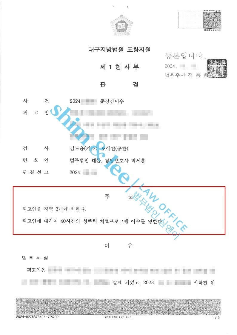 성폭력 치료강의 40시간 / 합의금 2,000만 원 -