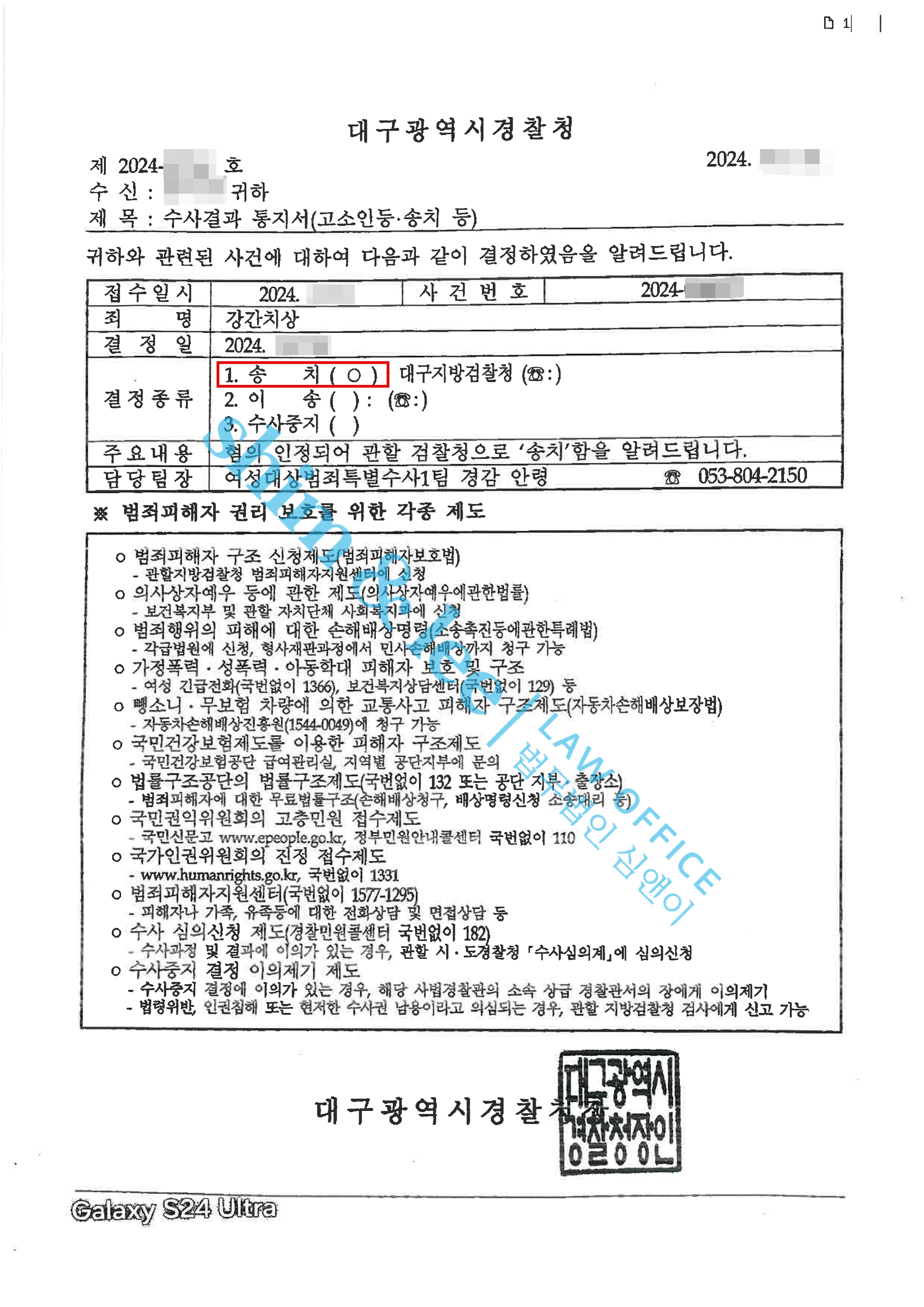 - 긴 경찰 수사 과정 끝에 가해자의 강간치상 혐의를 인정받아 기소 의견으로 검찰에 송치되었습니다. 의뢰인은 검찰로 송치될 수 있었던 것은 모두 사무실 덕분이라며 깊은 감사를 표하셨습니다.