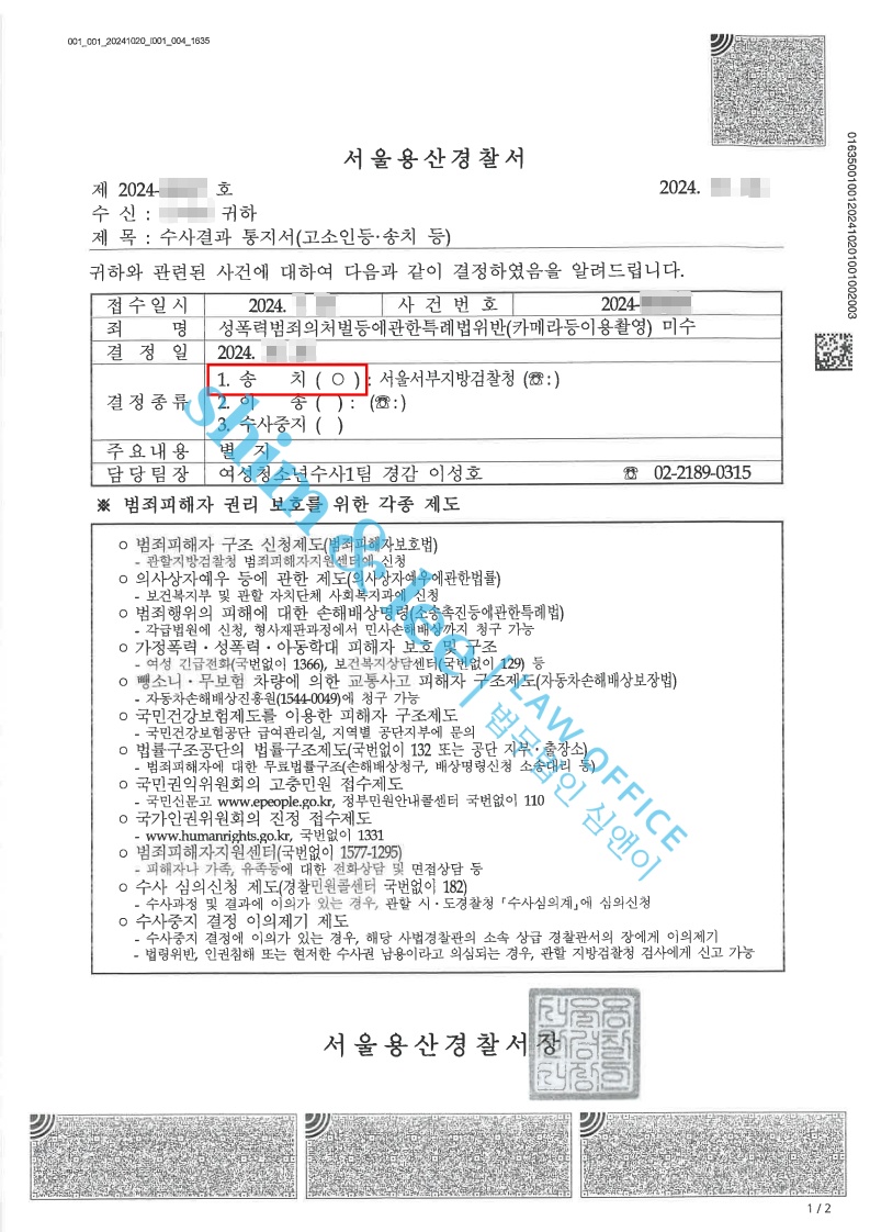 - 결국 경찰에서는 가해자가 혐의를 부인하고, 디지털 포렌식을 통해 발견된 촬영물도 없었지만 심앤이가 주장했던 객관적인 증거들이 인정되어 ‘카메라이용촬영미수’로 혐의 인정받아 기소 의견으로 검찰에 송치되었습니다.