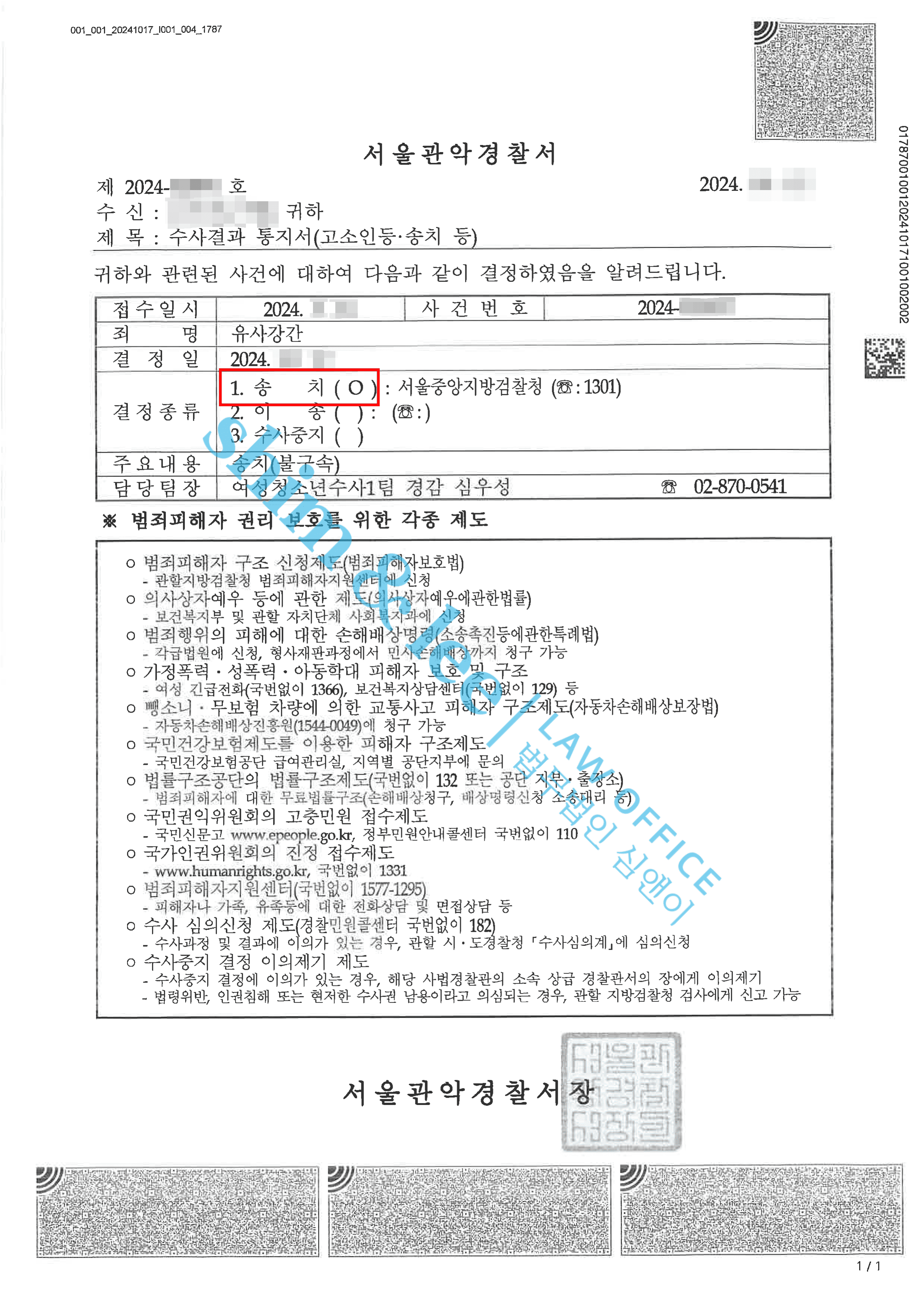 - 구체적인 의뢰인님의 진술과 그를 뒷받침하는 증거 자료들 그리고 변호사님의 의견서를 보시곤 결국 수사관님께서는 기소 의견 송치를 결정해 주셨고 사건은 검찰 단계로 무사히 넘어가 기소 처분을 받기 위해 최선을 다해 노력하고 있습니다.