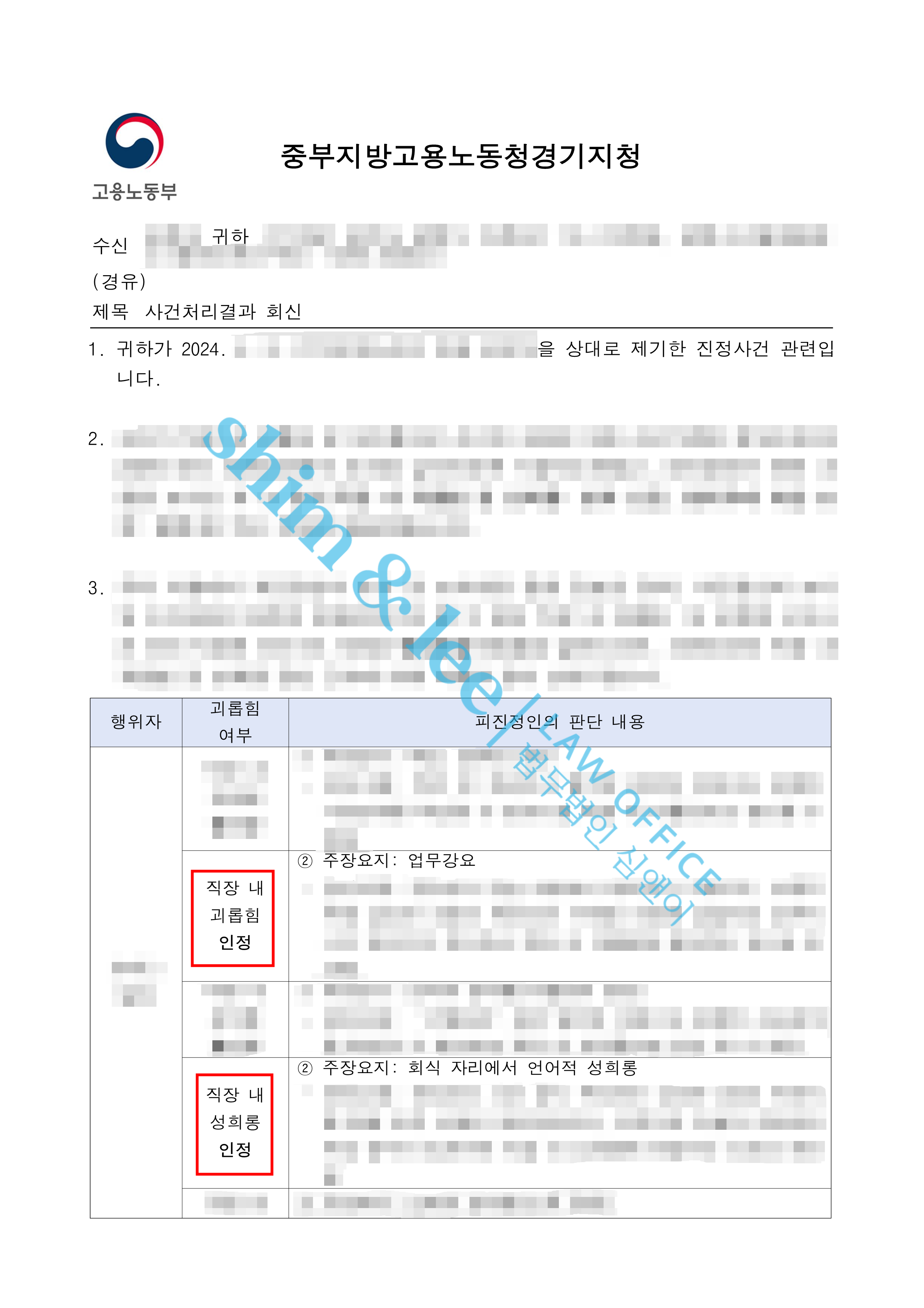 직장내 괴롭힘과 모욕으로 형사 고소대리 및 고용노동부 진정대리 동시 진행, 검찰송치와 인정처분 모두 받아낸 사건