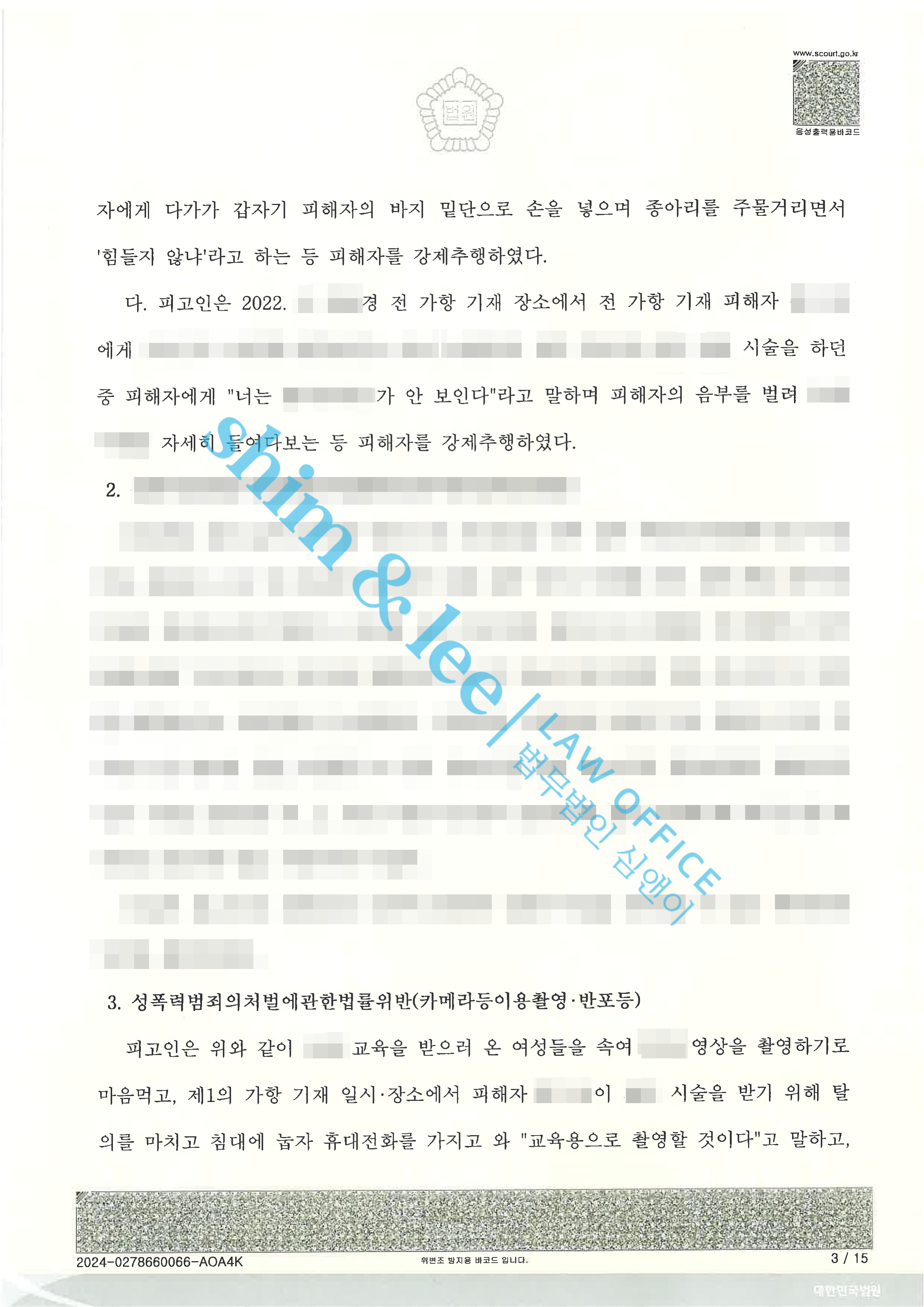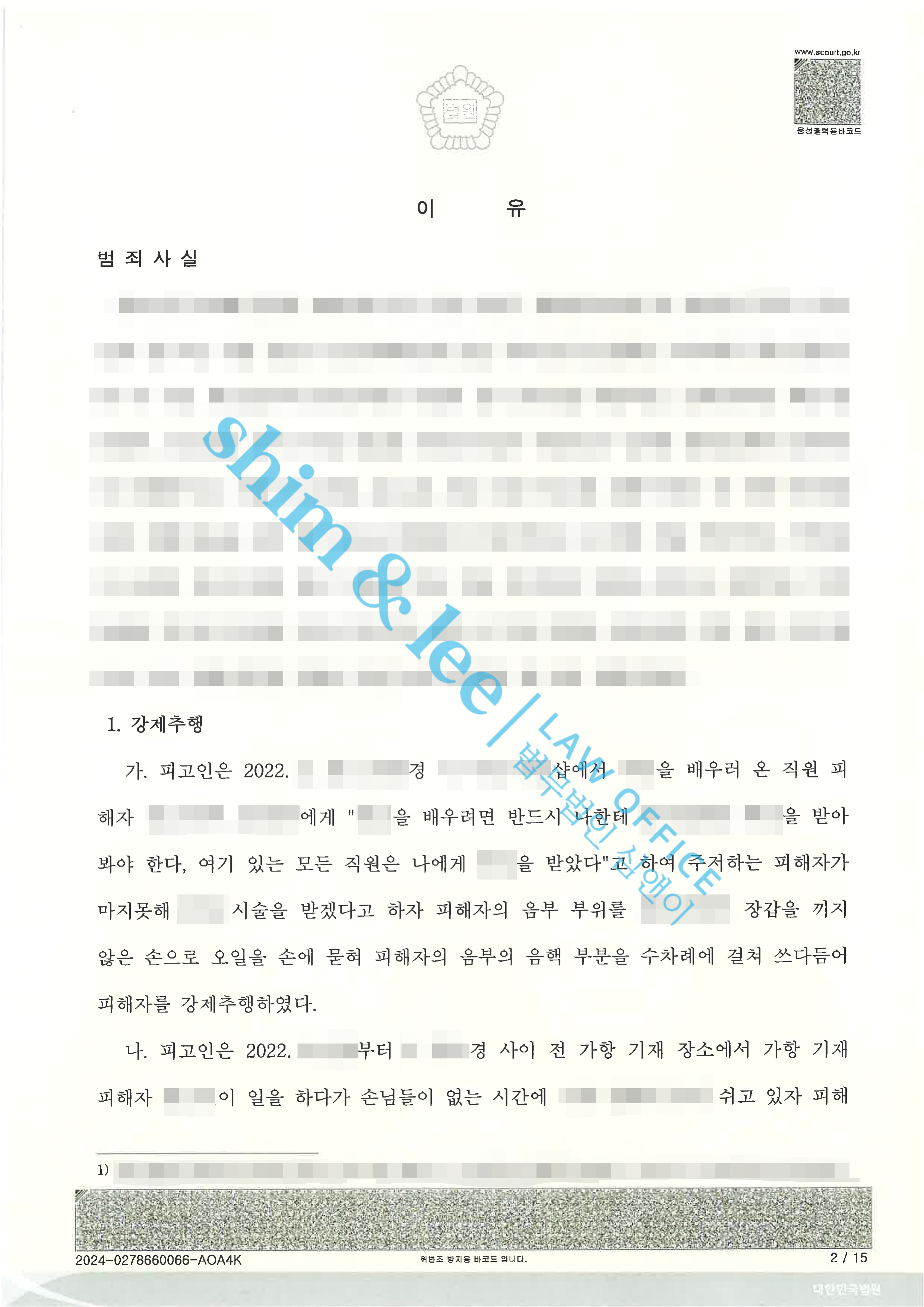 - 하지만 그 후 가해자는 쉬고 있는 의뢰인에게 다가와 종아리를 주무르거나 음란한 대화를 하는 등 부적절한 행동을 지속하였습니다. 의뢰인은 이것이 업무의 범위를 벗어난 명백한 범죄임을 깨닫고 신고를 하기 위해 퇴사를 하고, 심앤이를 찾아주셨습니다. -