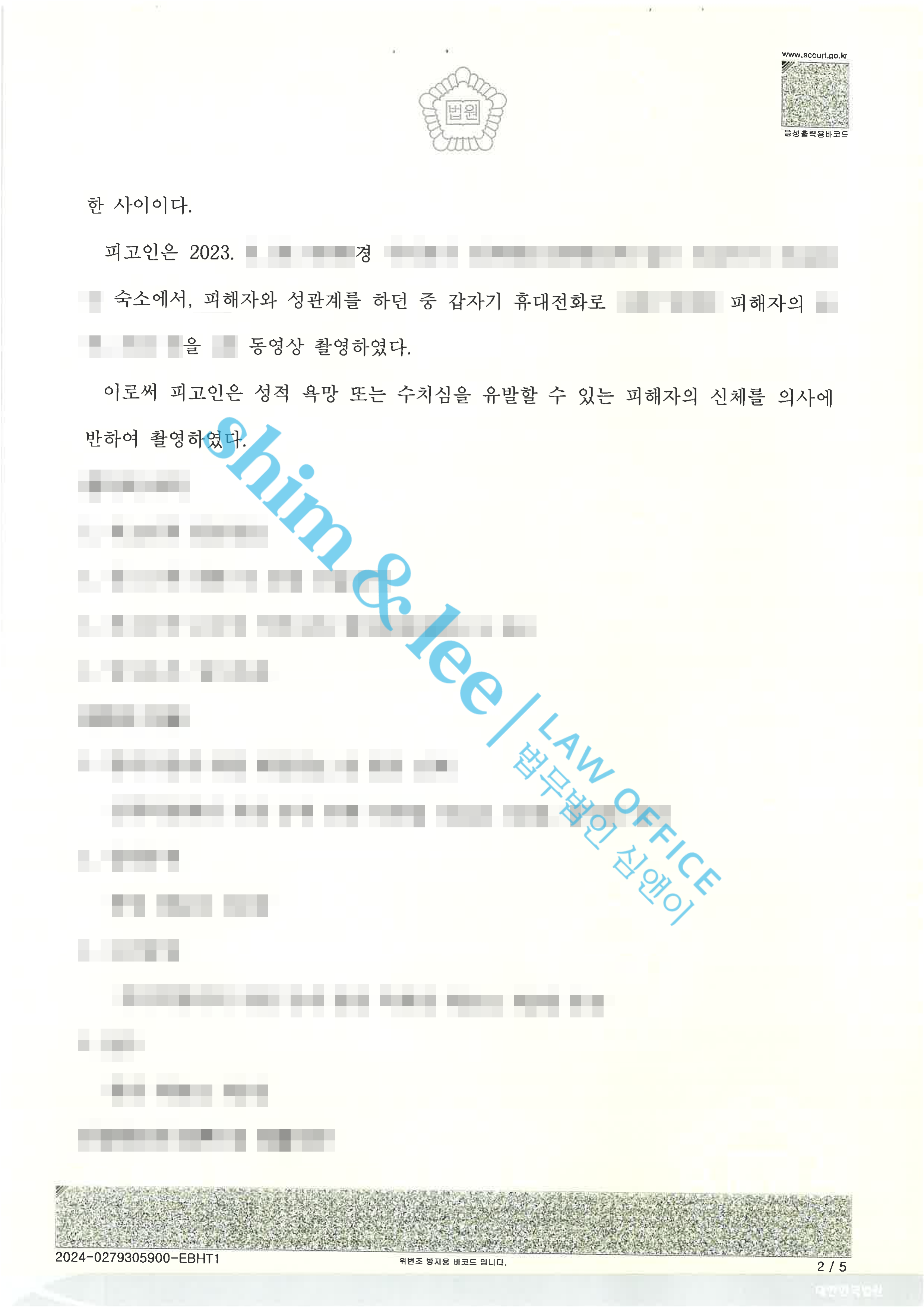 - 포렌식 결과 사진이나 영상이 따로 나오진 않았지만 의뢰인님의 일관된 진술과 심앤이의 구체적인 반박이 들어간 의견서로 가해자가 범행을 부인했음에도 사건은 혐의 있음으로 판단되어 재판단계로 넘어가게 되었고, 결국 가해자는 재판단계에서 본인의 범행을 인정하였습니다.