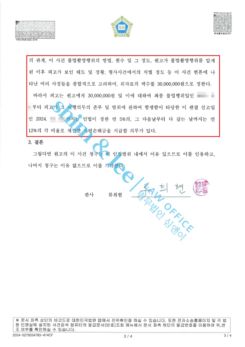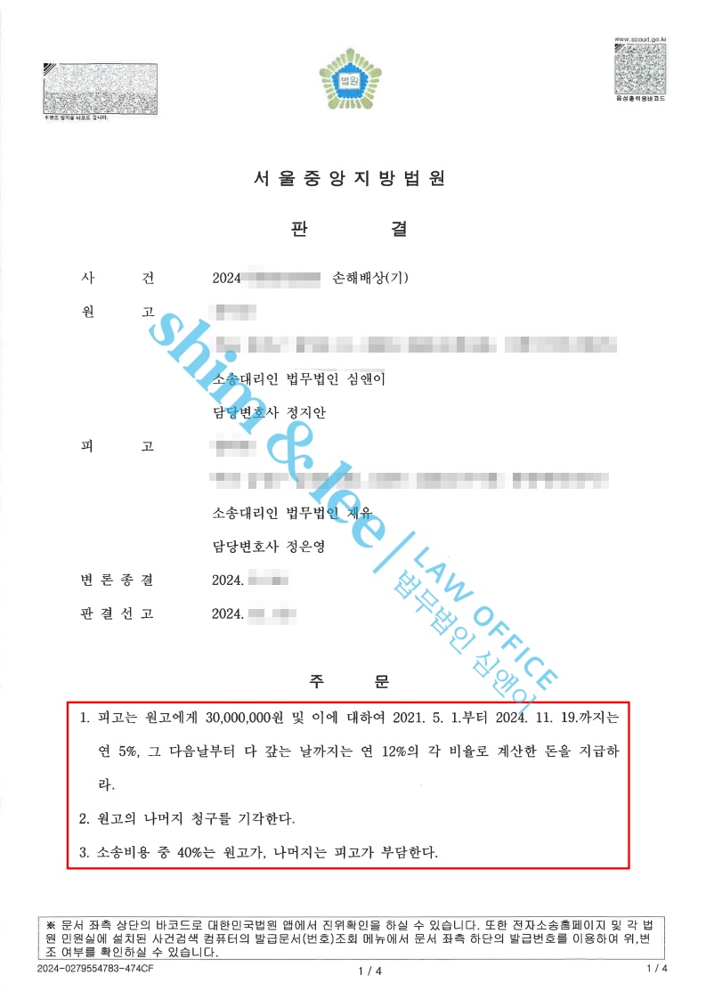 - 판결선고기일에는 심앤이가 목표로 진행했던 대로 손해배상 3,000만 원과 지연이자까지 많은 금액이 인용되었고, 소송비용은 원고 40% 나머지는 피고가 부담으로 변호사 비용 중 일부도 받아냈습니다.