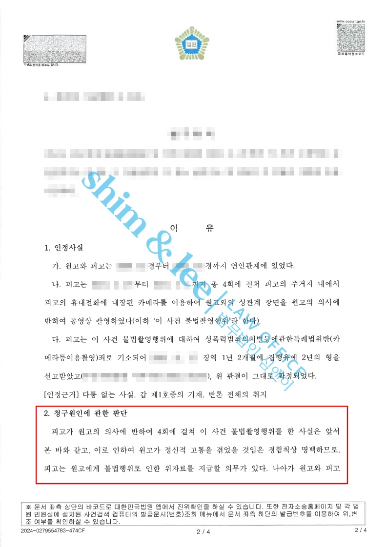 민사소송연인에게 불법촬영 피해, 위자료 손해배상 청구한 사건 2025.11.14손해배상금 1,000만 원 -