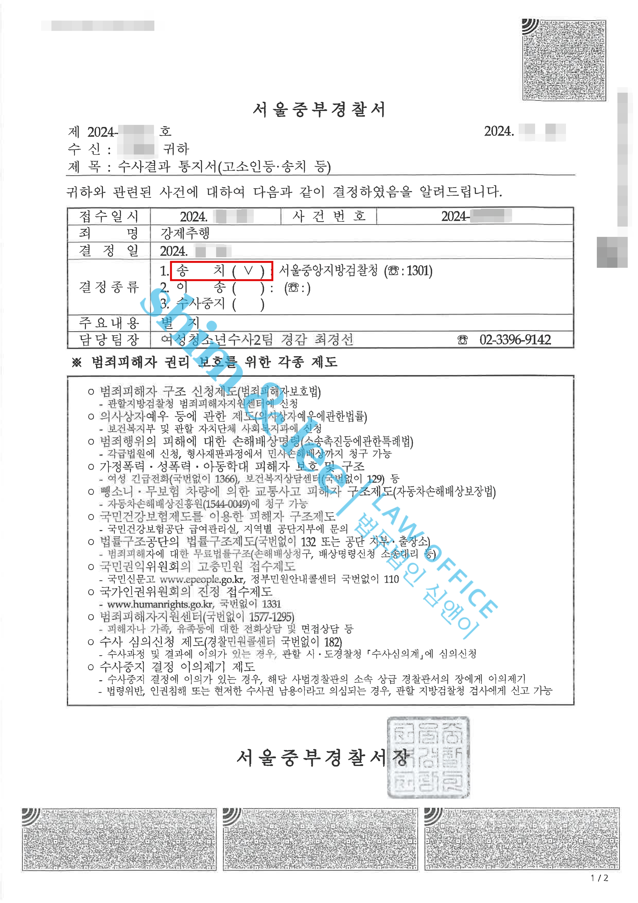- 경찰은 가해자의 강제추행 혐의를 인정하여 검찰로 송치 결정을 하였습니다.