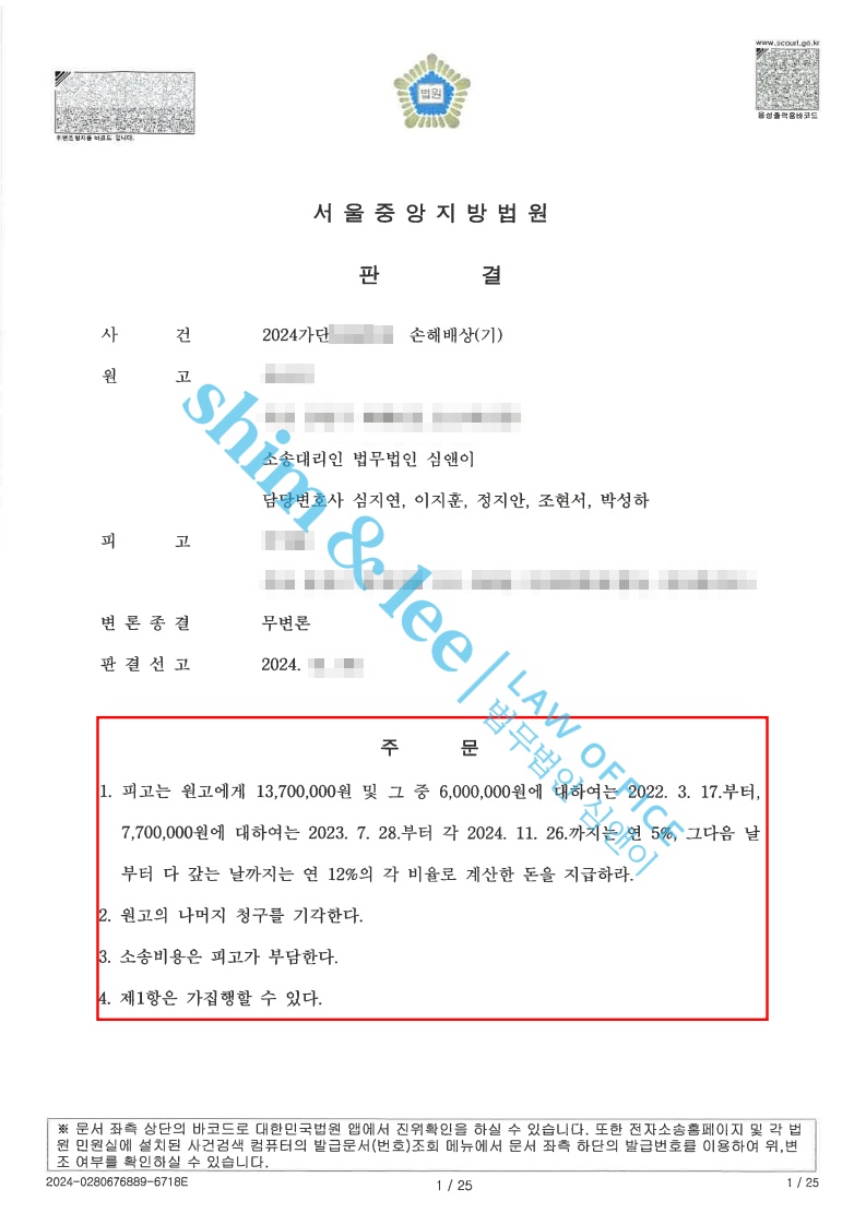 - 담당 변호사님은 즉시 피고에게 연락하여 판결금을 지급해야 할 의무가 있다고 통보하였고, 의뢰인께서 별도 집행 절차 없이 빠르게 지급받으실 수 있도록 마지막까지 조력했습니다.