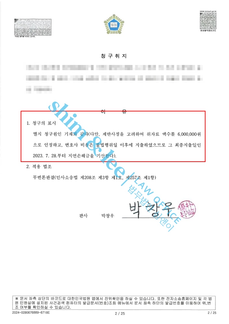 - 판결선고기일에는 심앤이가 주장했던 대로 의뢰인이 형사소송에서 사용한 변호사 비용 전액이 인용되었고, 위자료와 지연이자까지 받아냈습니다.