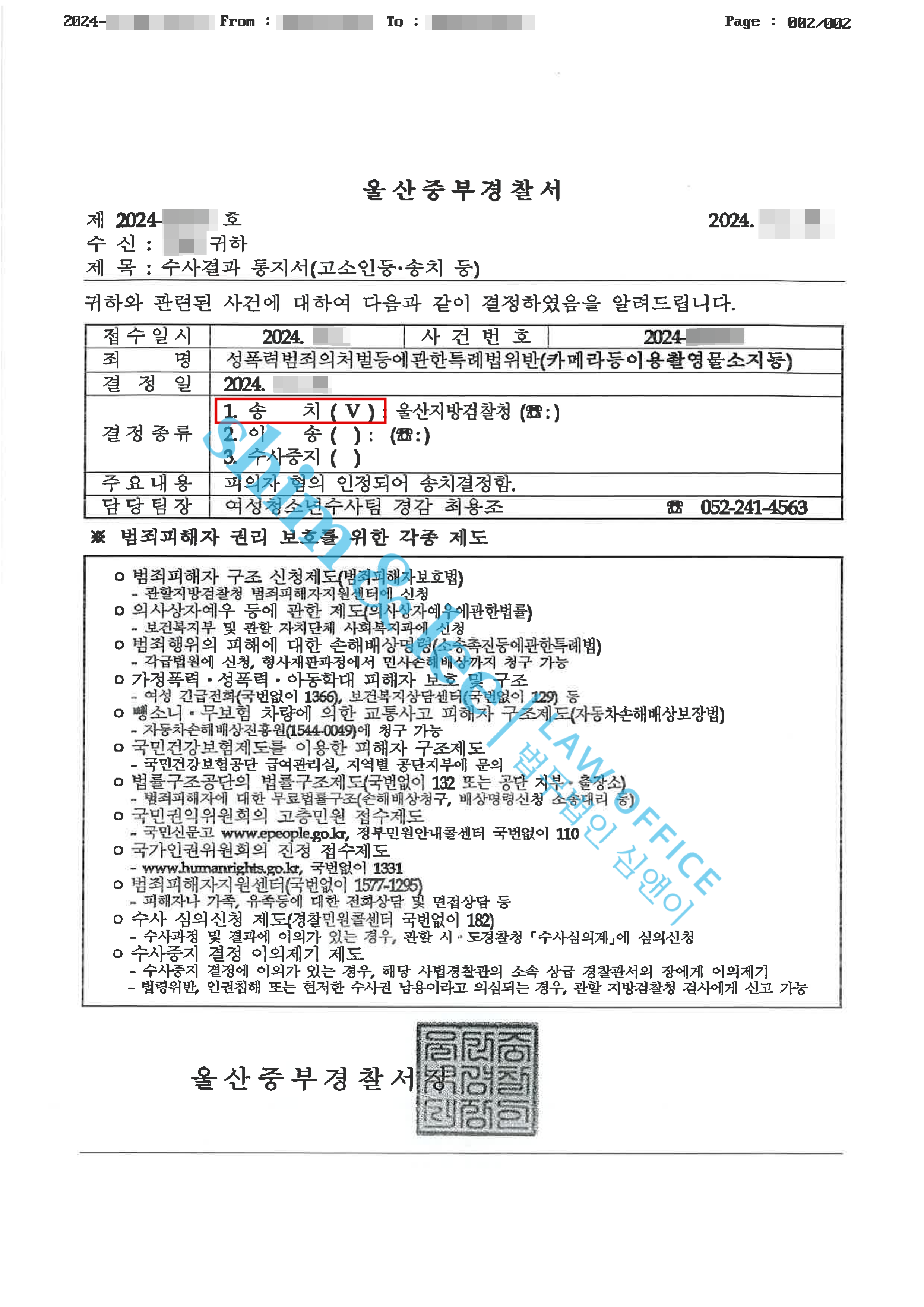 - 결국 가해자의 카메라 이용 촬영물 소지 혐의를 인정받아 사건은 검찰에 송치되었습니다.