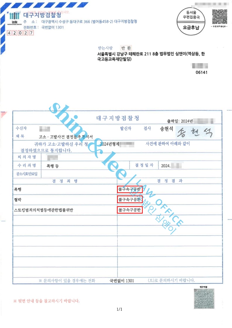 1) 데이트 폭력은 연인관계 내부의 개인적인 문제가 아니라 사회적 문제이며, 2) 가해자는 의뢰인에게 수개월간 정신적, 육체적 고통을 주었으며 3) 수사과정 내내 자신의 행동에 대해 반성하지 않는 태도로 폭행 사실을 부인하며 거짓말로 조사에 임하여 피해자를 2차 가해한 점을 강조하며 가해자에게 법이 허용되는 최대한의 처벌이 내려질 수 있도록 구공판 기소 처분을 내려주실 것을 간곡히 요청드렸습니다. -