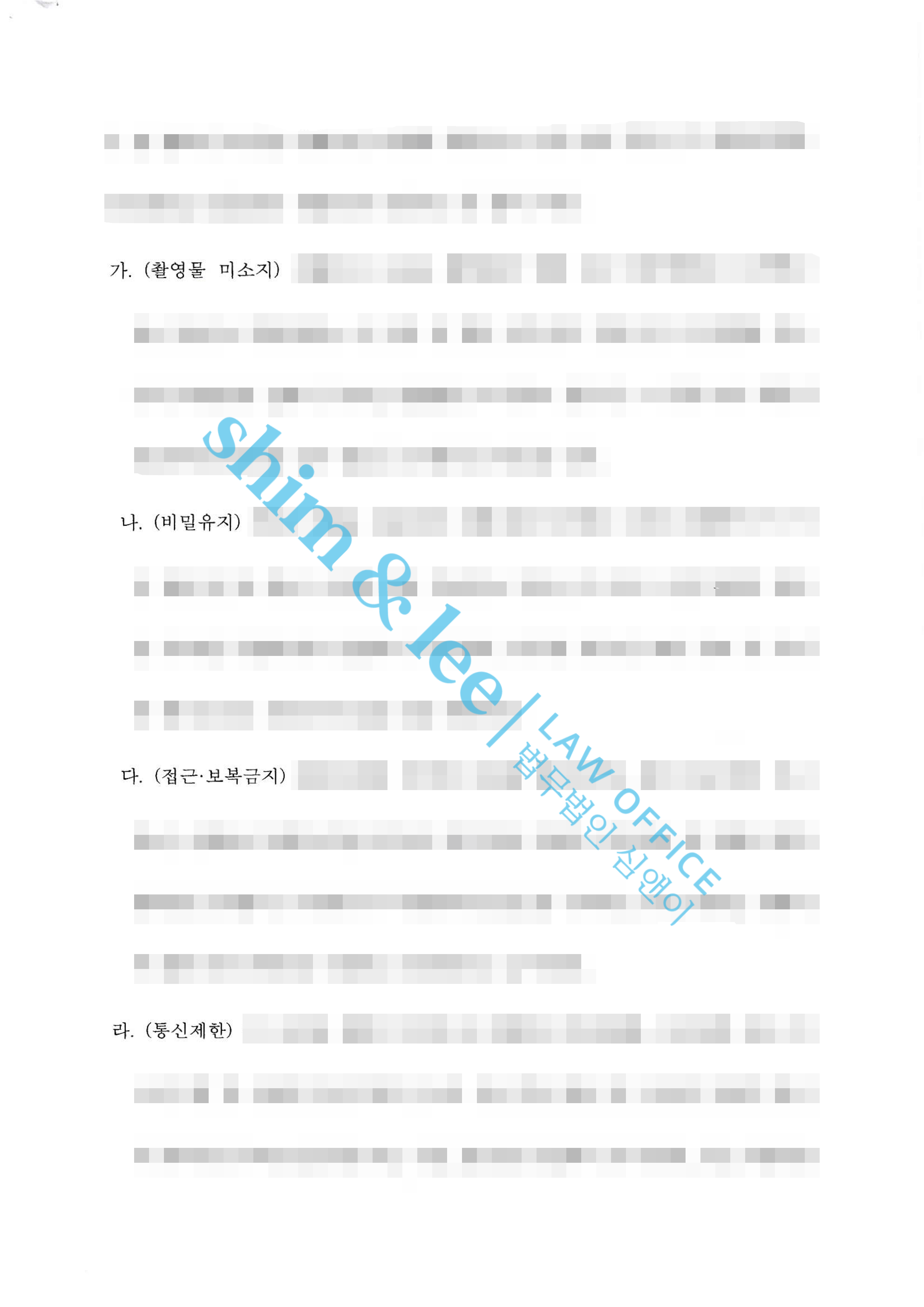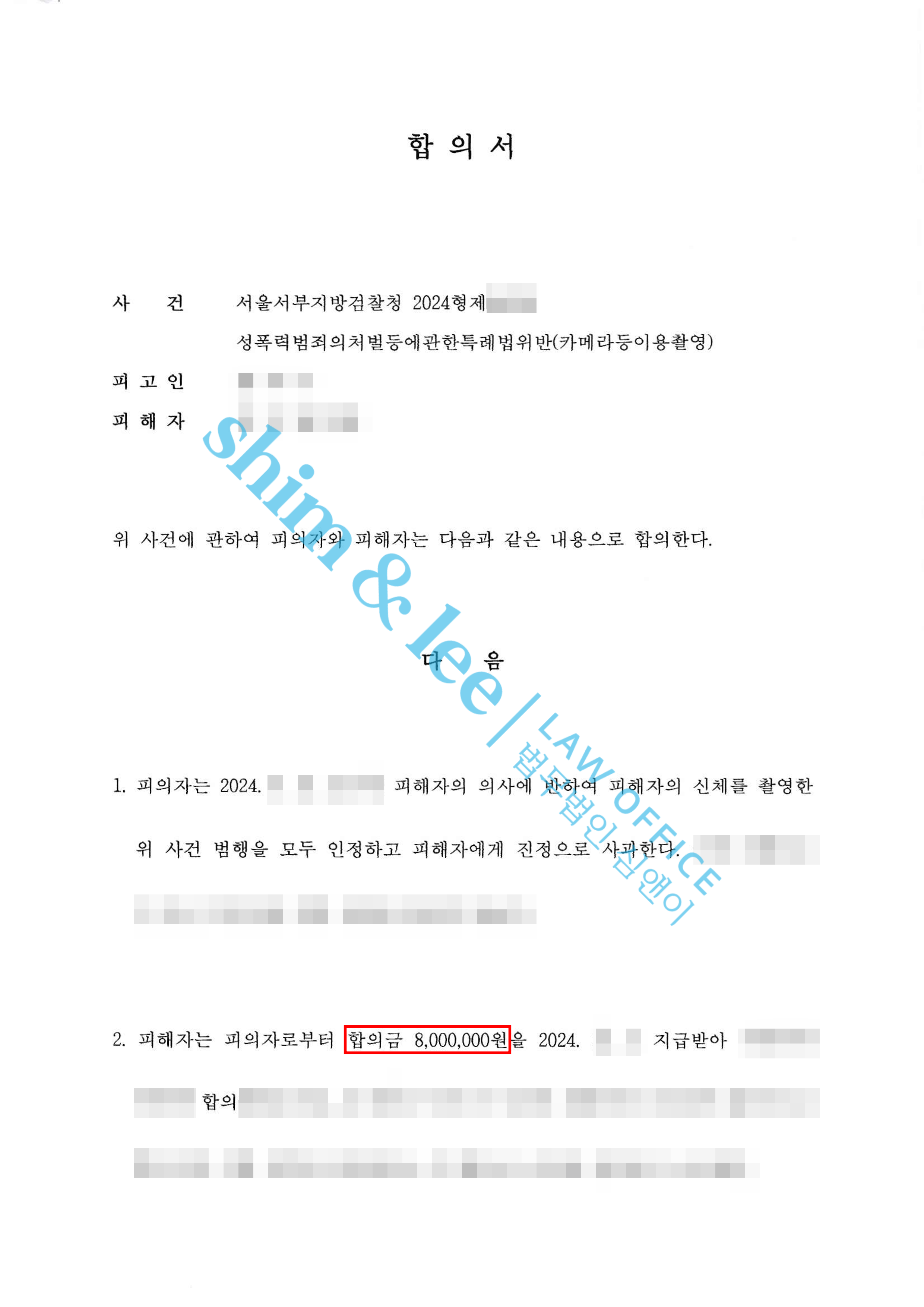 - 심앤이의 단호한 태도에 합의가 결렬 될까 겁을 먹은 가해자는 처음 제안하였던 금액의 약 3배인 800만 원으로 합의를 제안하였고, 이 밖에도 촬영물 미소지, 비밀유지, 접근/보복금지, 통신제한 등의 부가조항을 추가하여 의뢰인에게 유리한 조항으로 합의를 진행하였습니다.
