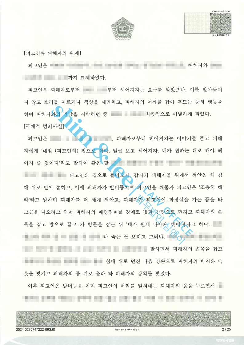 - 의뢰인님께서는 해당 사건으로 이미 PTSD진단을 받은 상태였으며 경찰서에 신고하려 했으나 남자 수사관의 태도에 두려워 신고하지 못하셨습니다. 그러나 결국 고소를 결심하고 저희 사무실을 찾아 주셨기에, 사건을 신속하고 정확하게 진행하기 위해 힘썼습니다.