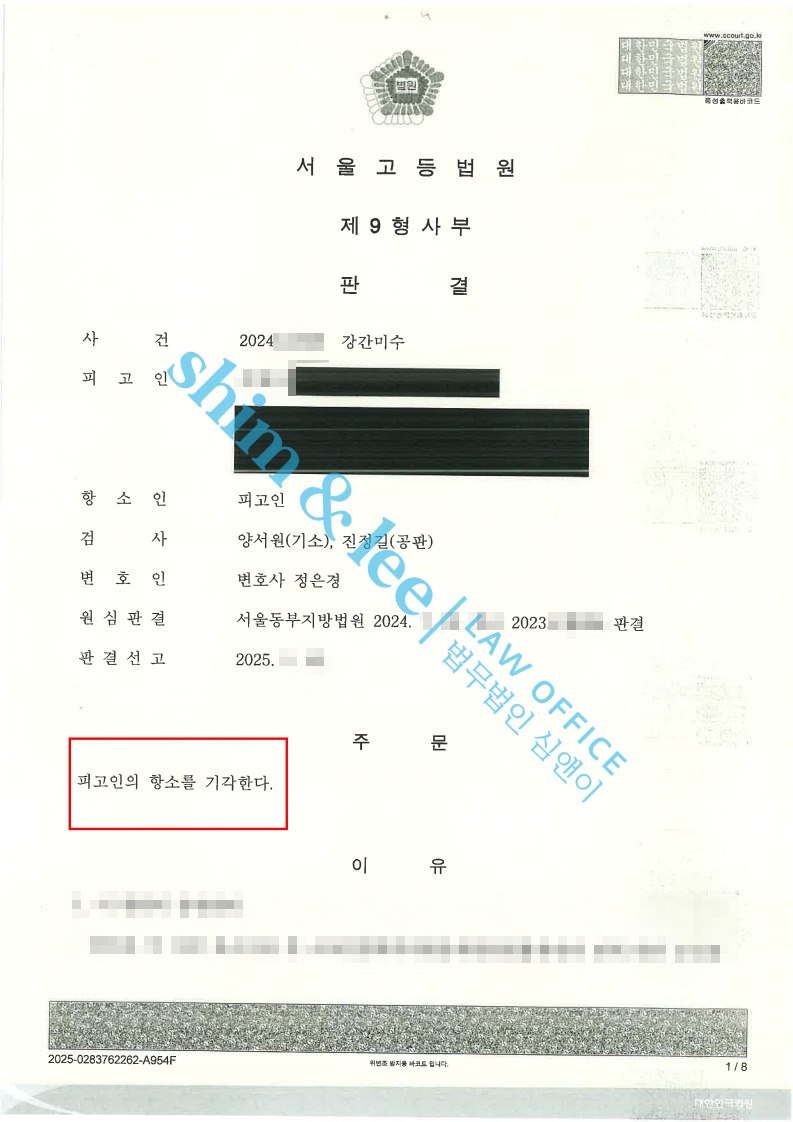 형사고소마사지샵에서 강제추행 당한 사건 2025.10.17항소 기각