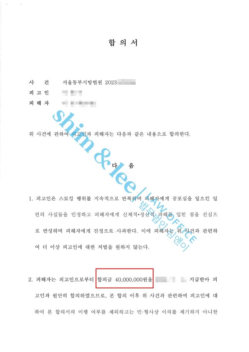 1. 가해자는 재판 단계에서도 강간미수 혐의를 부인하며 스토킹 혐의 일부만 인정하고 합의를 제안했습니다. 의뢰인은 가해자가 실형을 받더라도 자신을 평생 쫓아다닐 것 같아 두려움을 느끼셨고, 가해자와 완전히 관계를 끊고 싶다고 하셨습니다. 의뢰인의 의견을 반영하여 대표 변호사님은 가해자의 반성문을 받아낸 뒤 비밀 유지, 접근 및 보복 금지, 통신 제한 등의 조항과 위약벌을 포함한 합의서를 작성해 4천만 원에 합의를 진행했습니다. 또한, 재판부에는 가해자가 혐의를 부인하면서도 합의를 제안한 점과 피해자는 강간미수가 있었다는 주장은 변함이 없다고 전달했습니다. -
