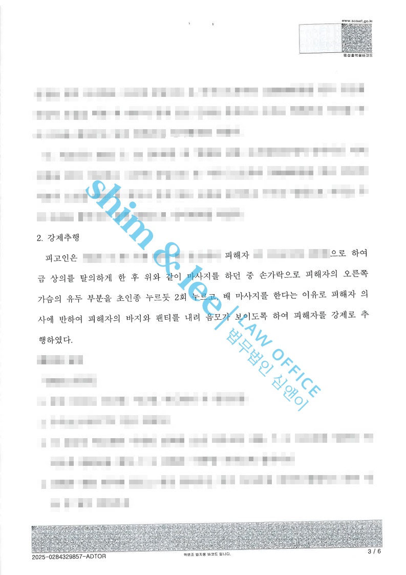 - 의뢰인이 홀로 경찰서를 방문하여 사건을 접수하였으며, 경찰 조사를 앞두고 있었습니다. 수사관은 환불 후 합의하는 것이 어떻겠냐는 의견을 제시하며, 사건화가 어렵다는 입장을 보이고 있음을 확인했습니다. 이에 대표 변호사님은 가해자가 마사지의 범위를 넘어선 점, 피해자가 즉시 항의하지 못한 이유, 그리고 구체적인 행위를 강조하여 경찰 조사 전에 충분히 대비하고 사건을 진행하고자 했습니다.
