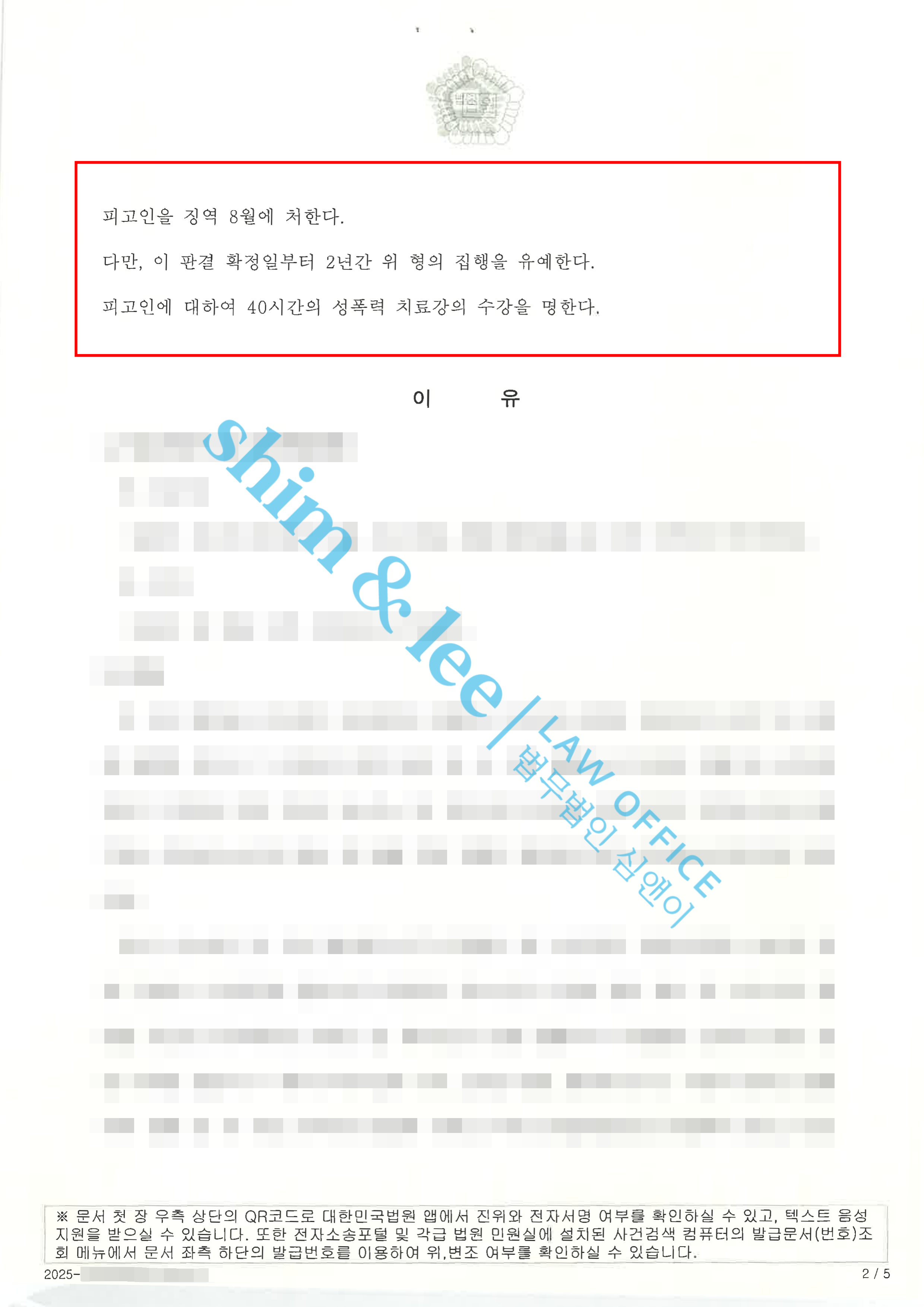 - 합의 이후 항소심 재판부는 가해자에게 징역 8개월, 집행유예 2년, 성폭력 치료강의 40시간 수강을 선고하였습니다.
