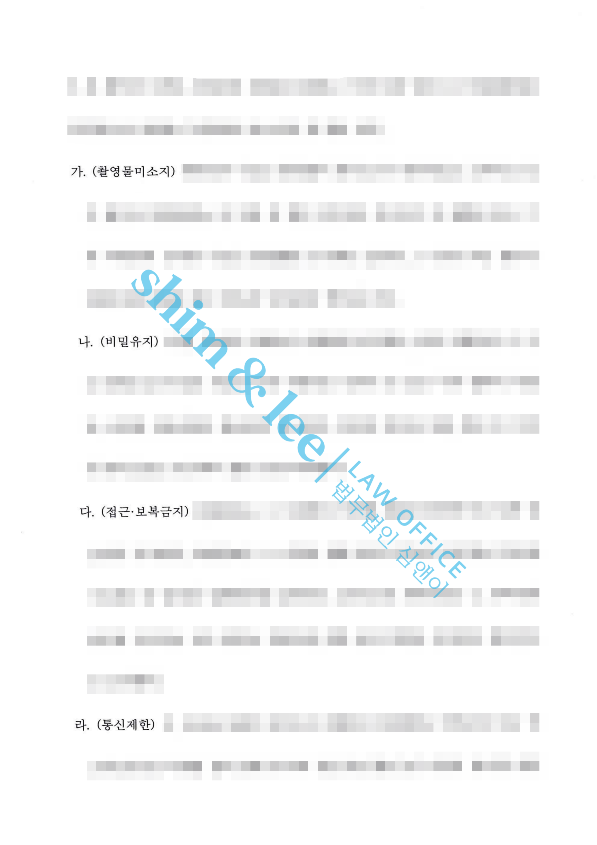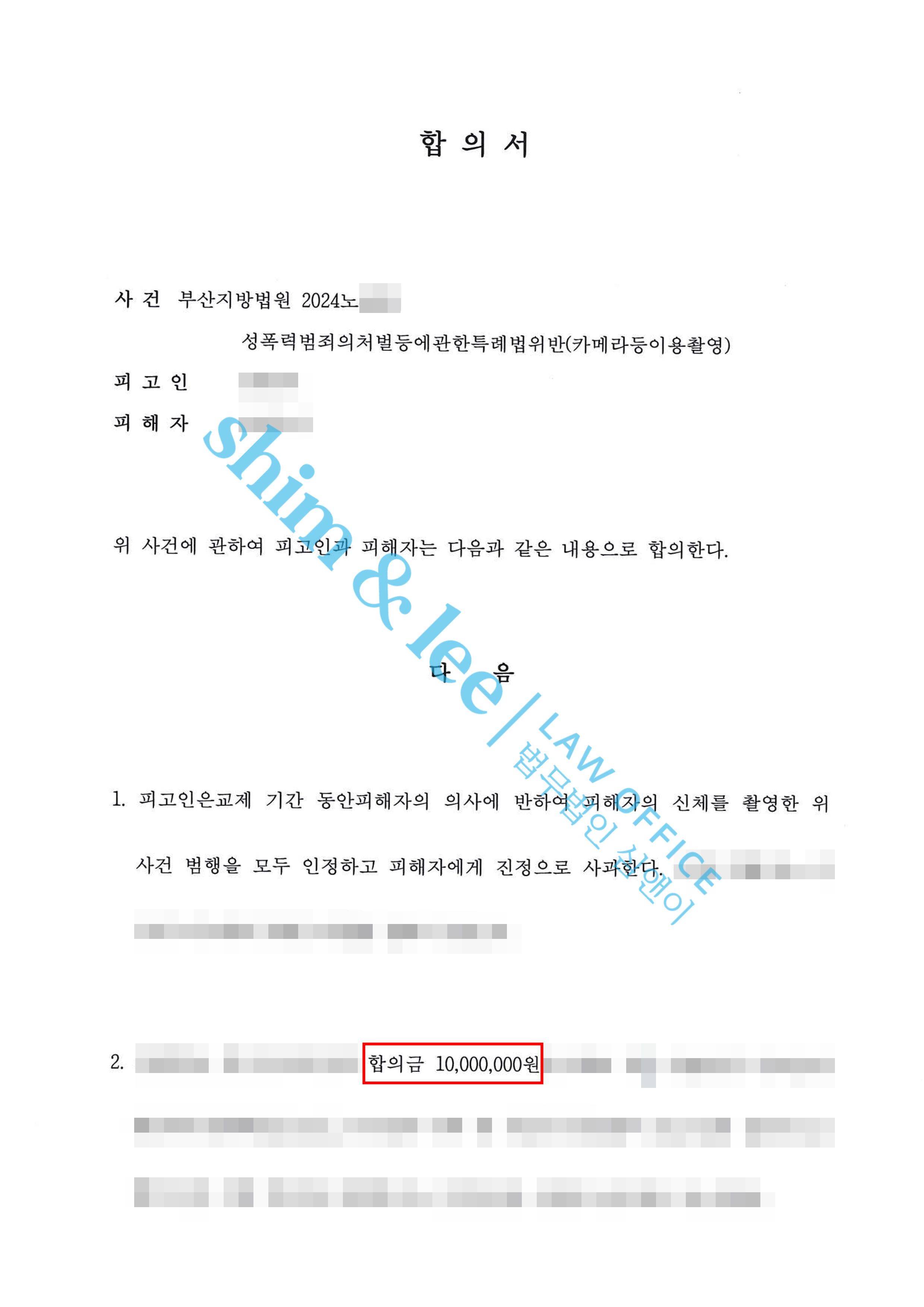 - 합의서에는 가해자가 혐의를 전부 인정하고 피해자에게 진정으로 사과한다는 내용 뿐만 아니라 촬영물 미소지, 비밀유지, 접근 및 보복 금지, 통신 제한 등의 조항이 포함되었습니다. 또한 위약벌 조항을 추가하여 최종적으로 1,000만 원으로 합의를 마무리하였습니다.