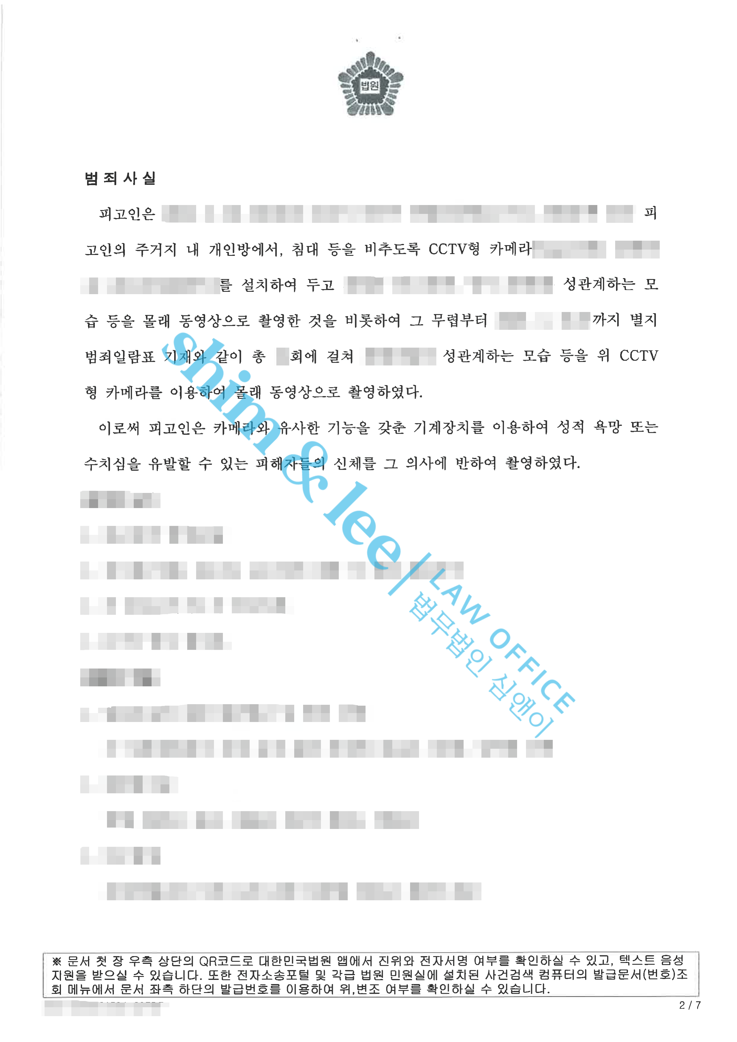 담당 변호사님은 사람들이 오고 가는 거실이 아닌 침대 바로 위에 방범용 cctv를 설치한 것엔 모순이 있으며 해당 카메라는 정확히 침대를 비추고 있었다는 점을 강조한 변호사 의견서를 제출하였습니다. 또한, 의뢰인의 동의 없이 약 10회에 걸쳐 불법 촬영이 이루어진 사실은 명백히 카메라이용촬영죄에 해당함을 주장하였습니다