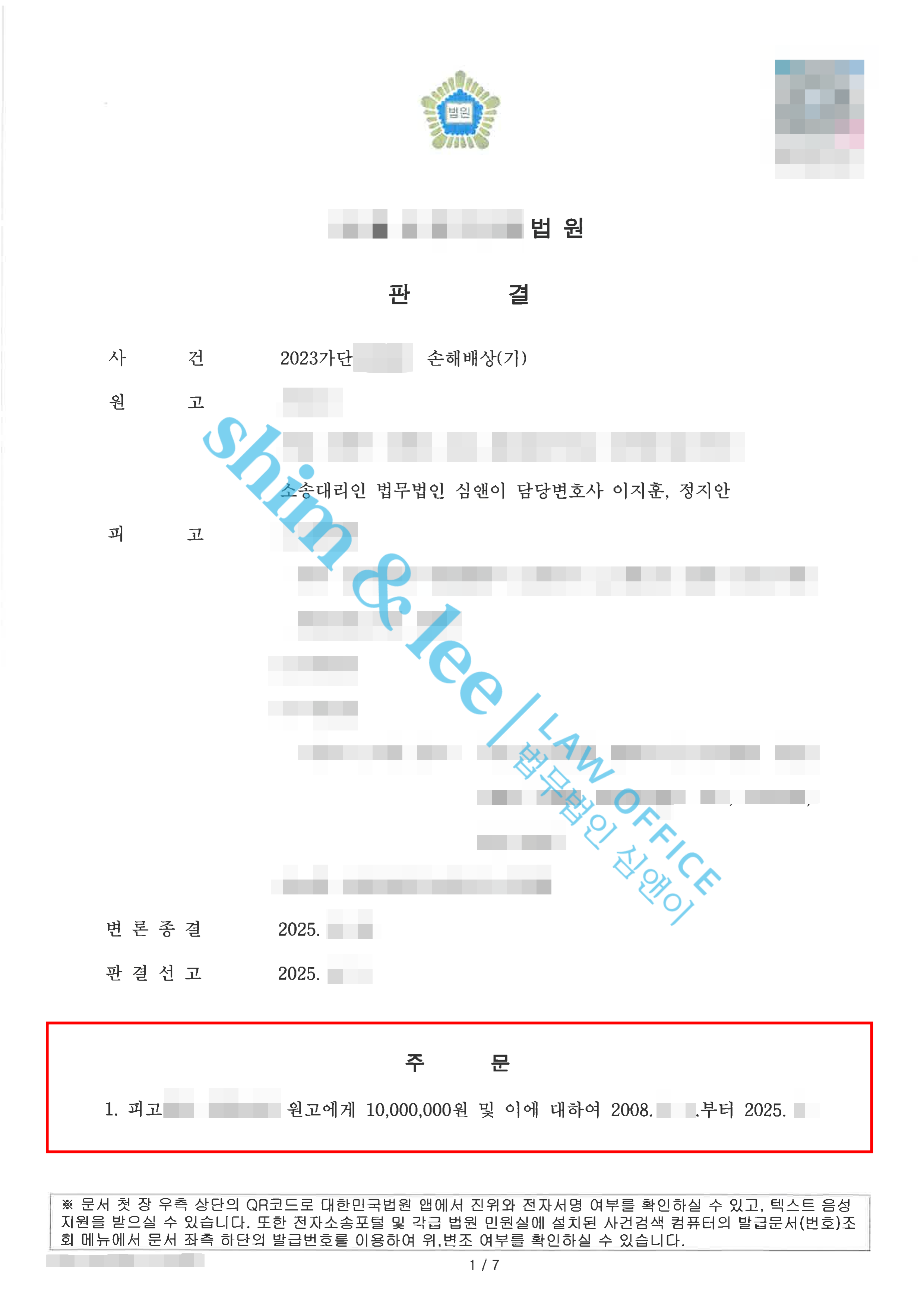 - 판결을 확인한 의뢰인은 위자료 액수보다도 피고의 불법행위를 법적으로 인정받았다는 점에 큰 만족을 표하며 사건을 꼼꼼하게 진행해 준 심앤이에 깊은 감사의 뜻을 전하셨습니다.