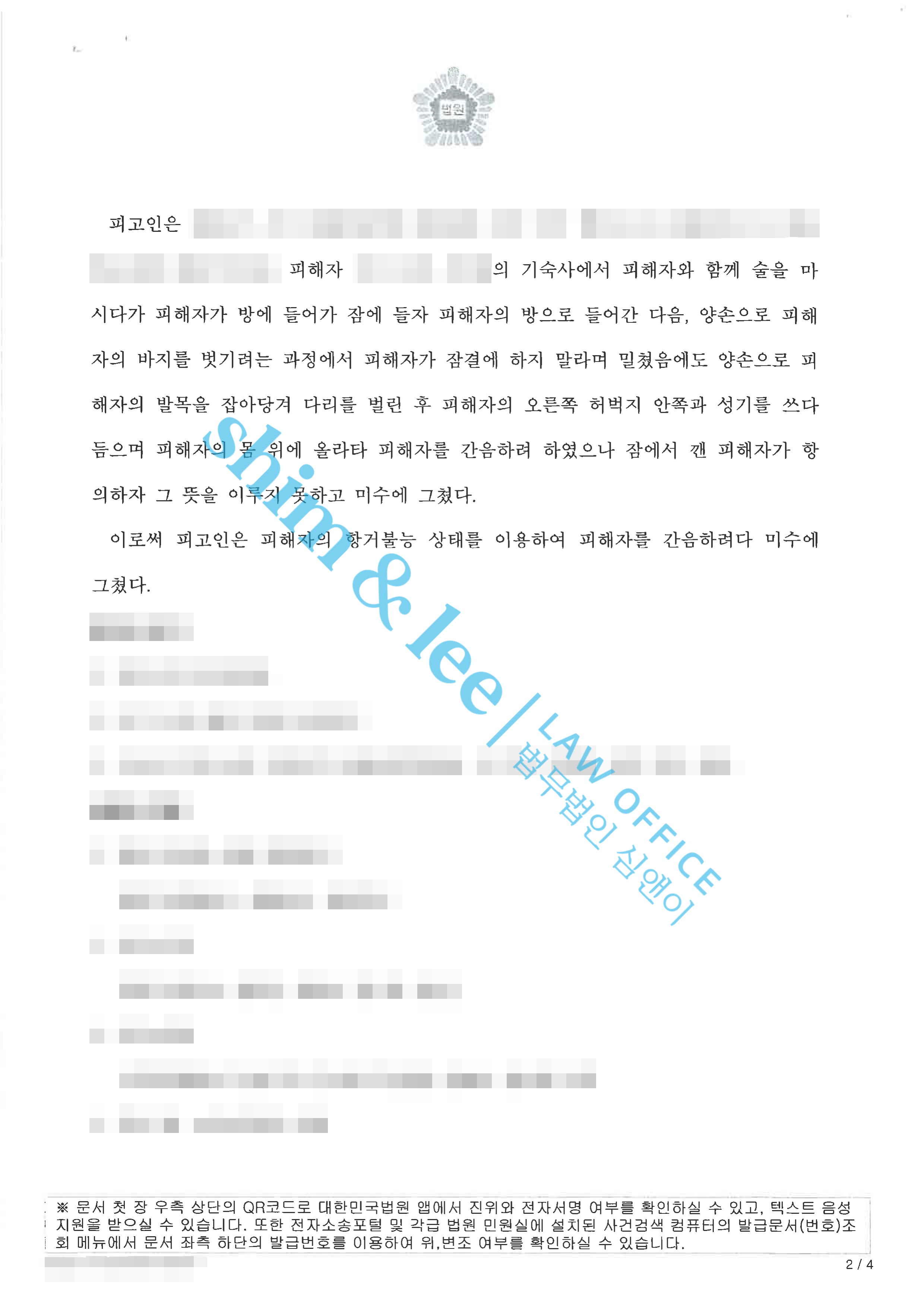 - 너무 놀란 의뢰인은 즉시 가해자를 발로 차고 방 밖으로 뛰쳐나갔고, 가해자는 도망치듯 숙소를 빠져나갔습니다. 의뢰인은 그런 가해자를 엄벌 하기 위해 심앤이를 찾아오셨습니다. -
