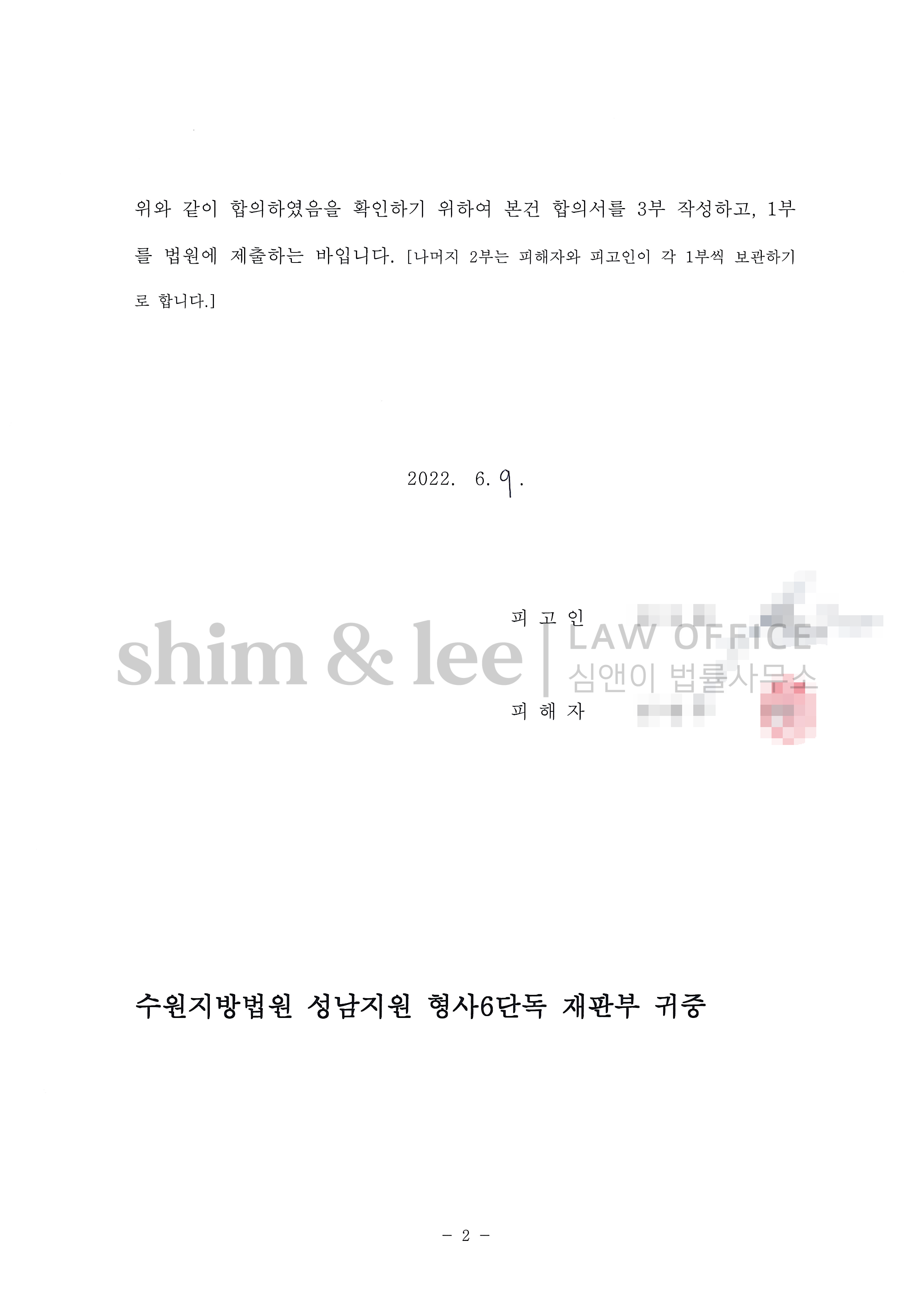 재판단계까지 오자 가해자는 겁을 먹고 변호사까지 선임해서 훨씬 적극적으로 합의를 요청해왔습니다. 재판까지 온 이상 합의를 해주더라도 최소한 벌금형 처벌은 내려질 가능성이 높았기 때문에, 의뢰인도 마음을 놓고 합의에 동의할 수 있었습니다.