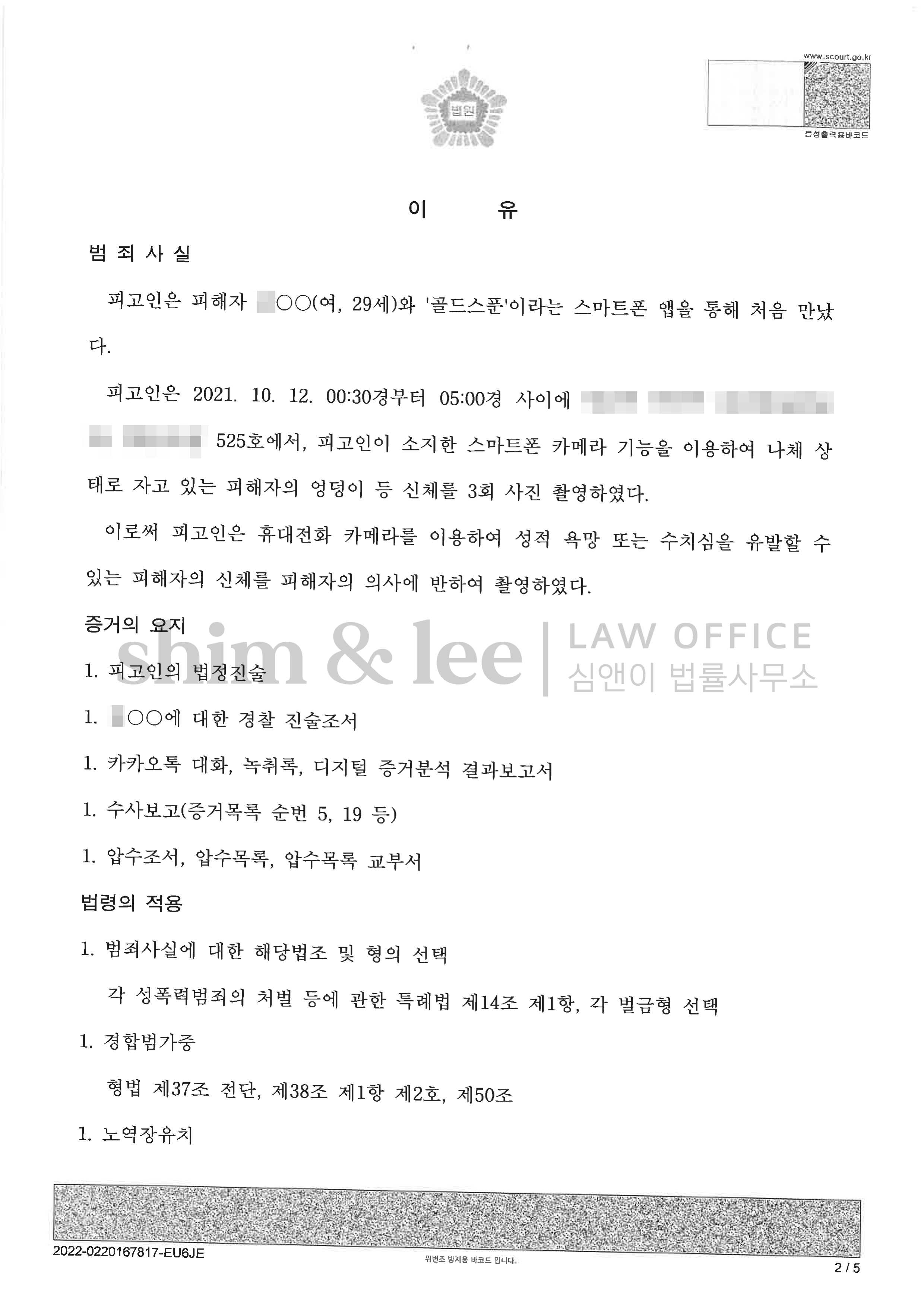 심앤이의 지속적인 노력으로 이 사건은 유포되지 않은 일회성 단순 몰카인데도 정식기소 구공판으로 진행되었습니다. -
