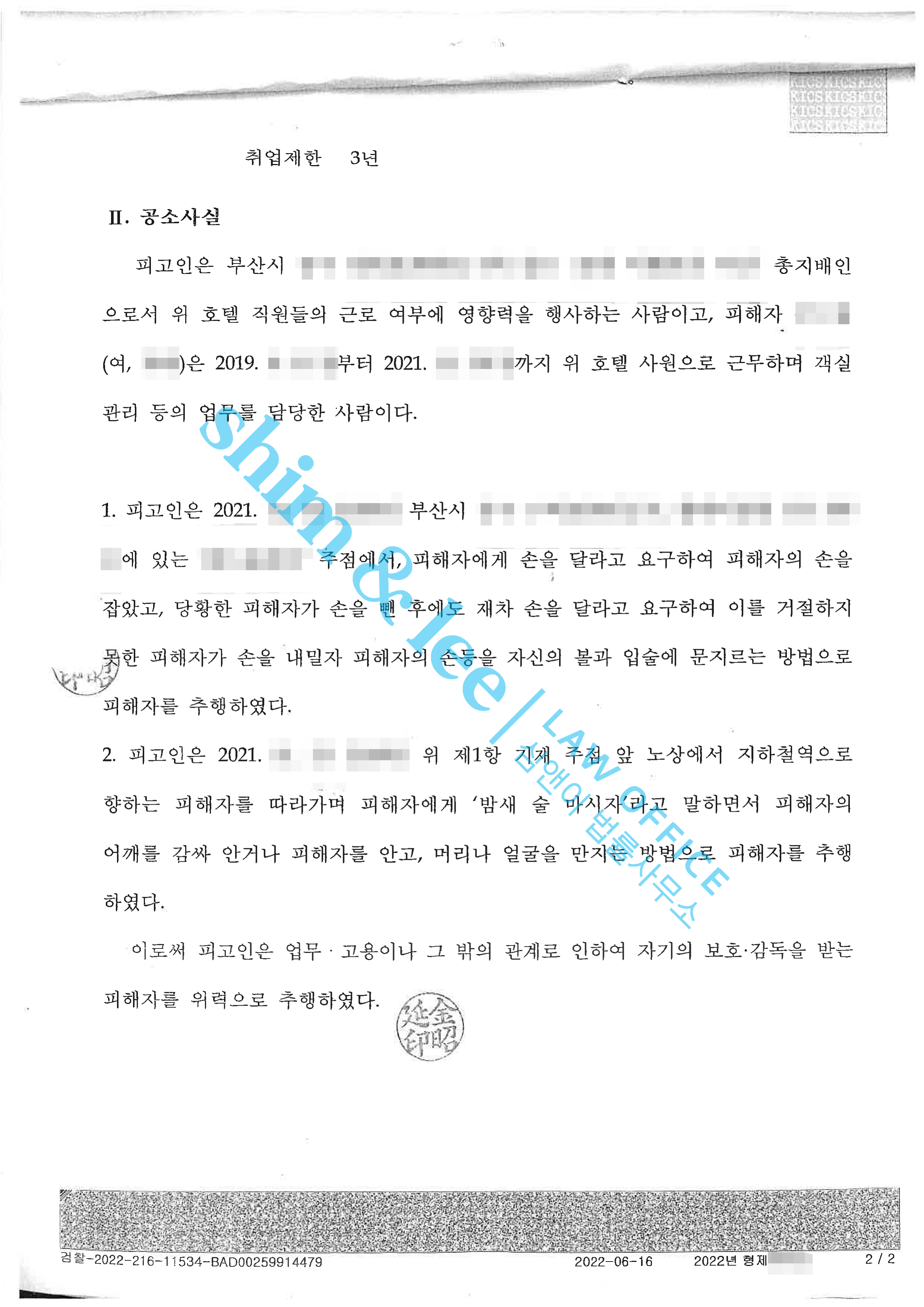 형사고소직장 상사인 가해자로부터 2년 동안 약 30차례 추행당한 사례 2021.11.30징역 1년 6월 / 집행유예 3년