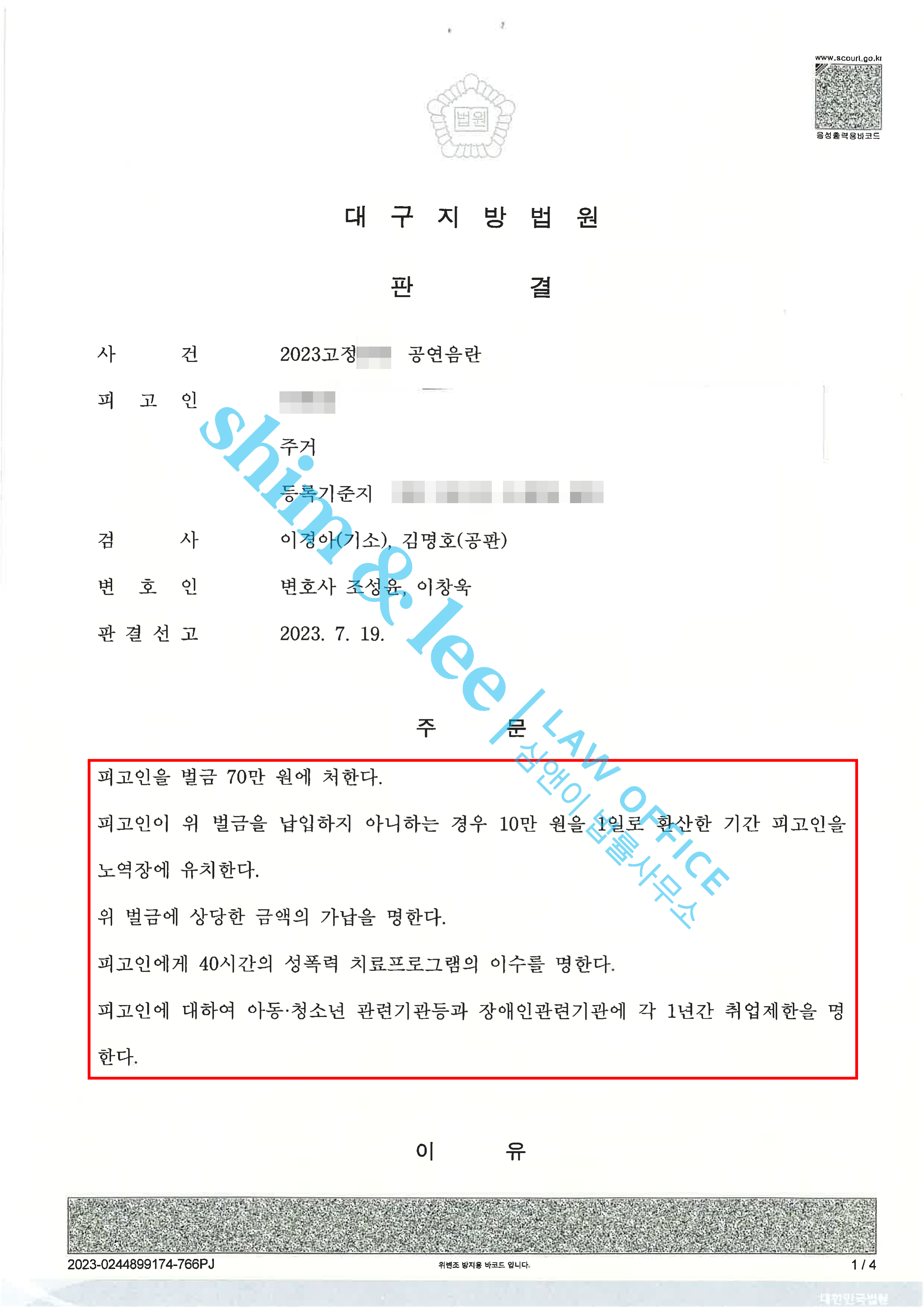 성폭력 치료강의 40시간 / 합의금 1,700만 원 -
