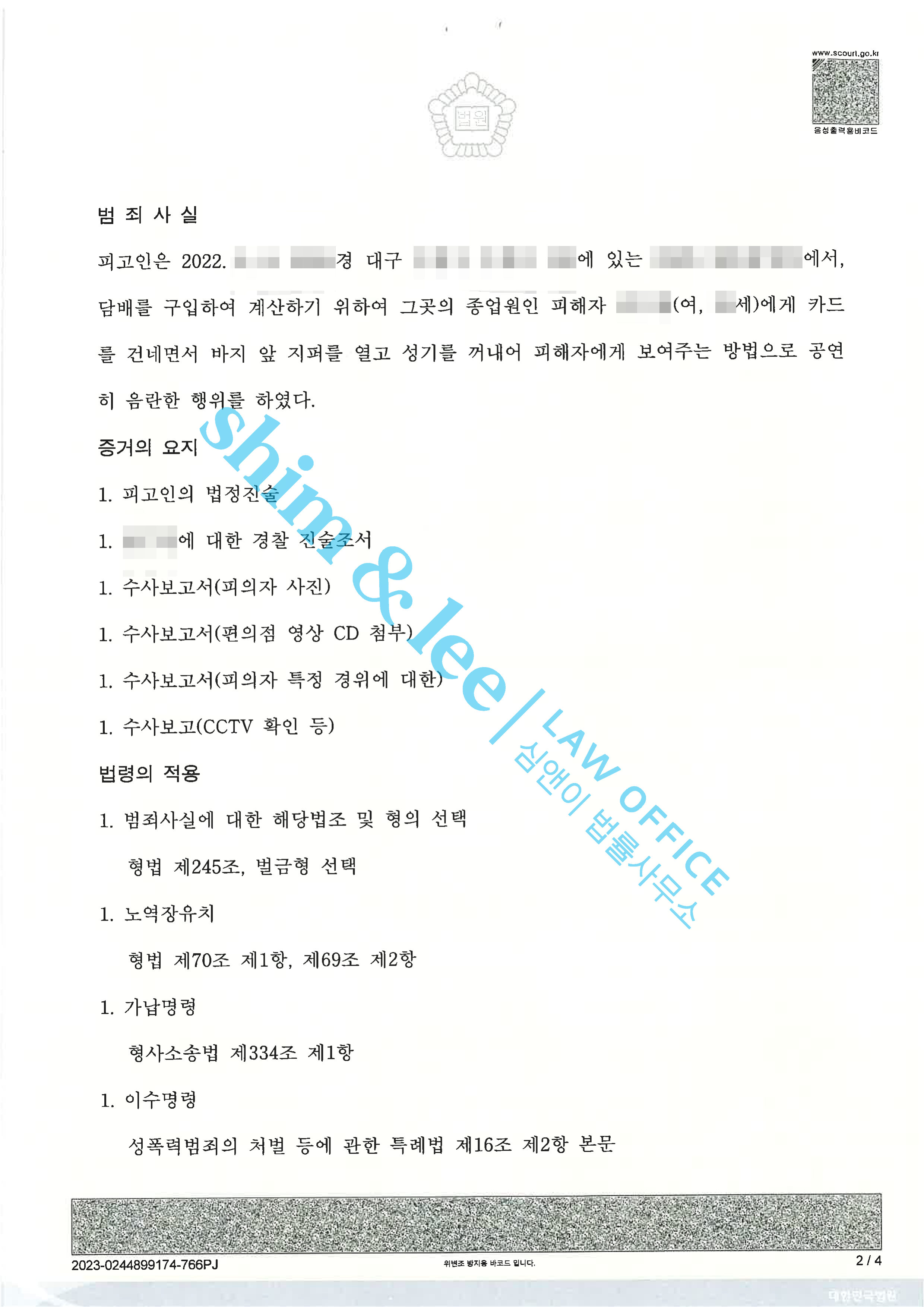 피해자는 편의점 아르바이트생이었고, 가해자는 대학생 정도 되어 보이는 편의점 손님이었습니다. 가해자는 피해자에게 담배를 달라고 했고, 피해자가 뒤돌아 담배를 찾는 사이 갑자기 바지 지퍼를 내리고 자신의 성기를 꺼내 노출시킨 상태로 카드를 내밀었습니다. 너무 당황스러웠던 피해자는 못 본 척하며 정상적으로 결제를 마쳤고, 가해자가 편의점을 나가자마자 얼른 문을 걸어 잠그고 경찰에 신고했습니다.