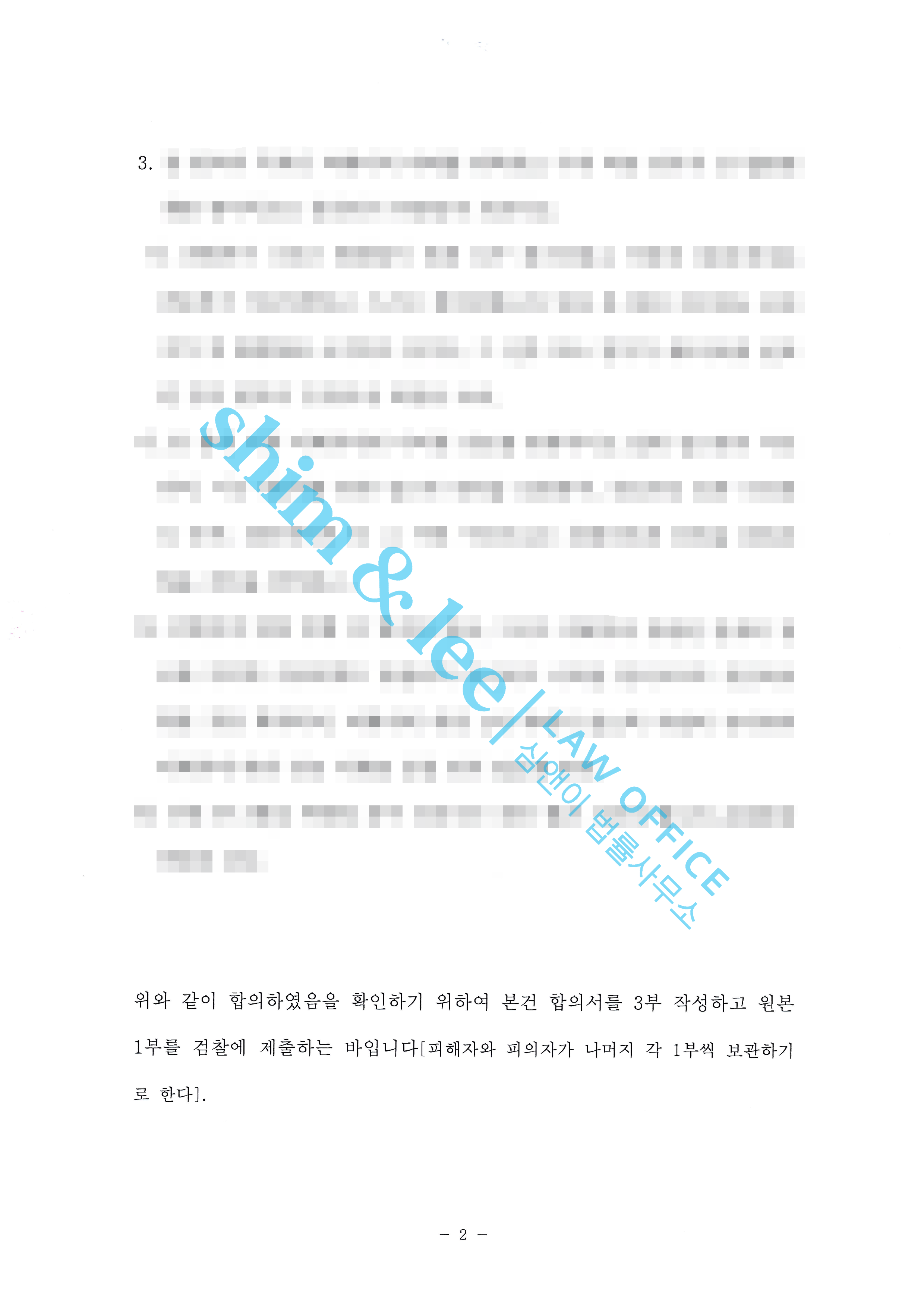 피해자와 피해자의 부모님들 모두 추가 피해가 없었다는 점과 원하는 대로 높은 금액으로 피해보상을 받았다는 것에 아주 만족하셨고, 무엇보다 사건이 발생한 지 6개월도 지나지 않아 신속하게 모든 절차를 마무리해준 심앤이에 너무나 큰 감사를 표하셨습니다.