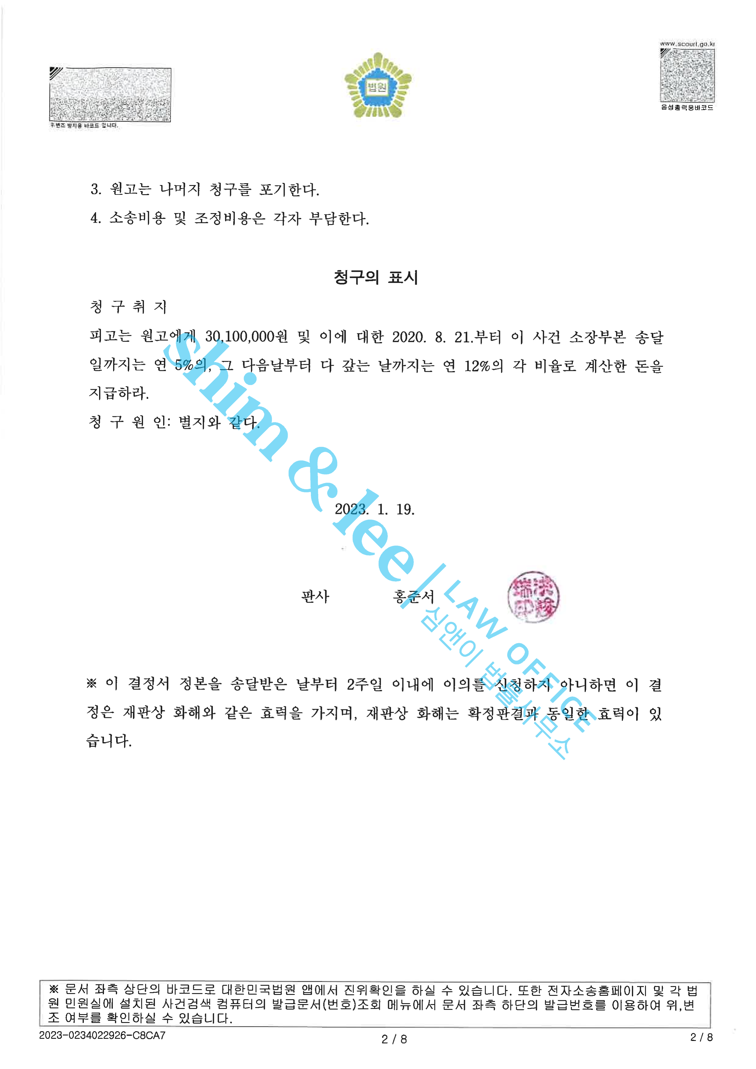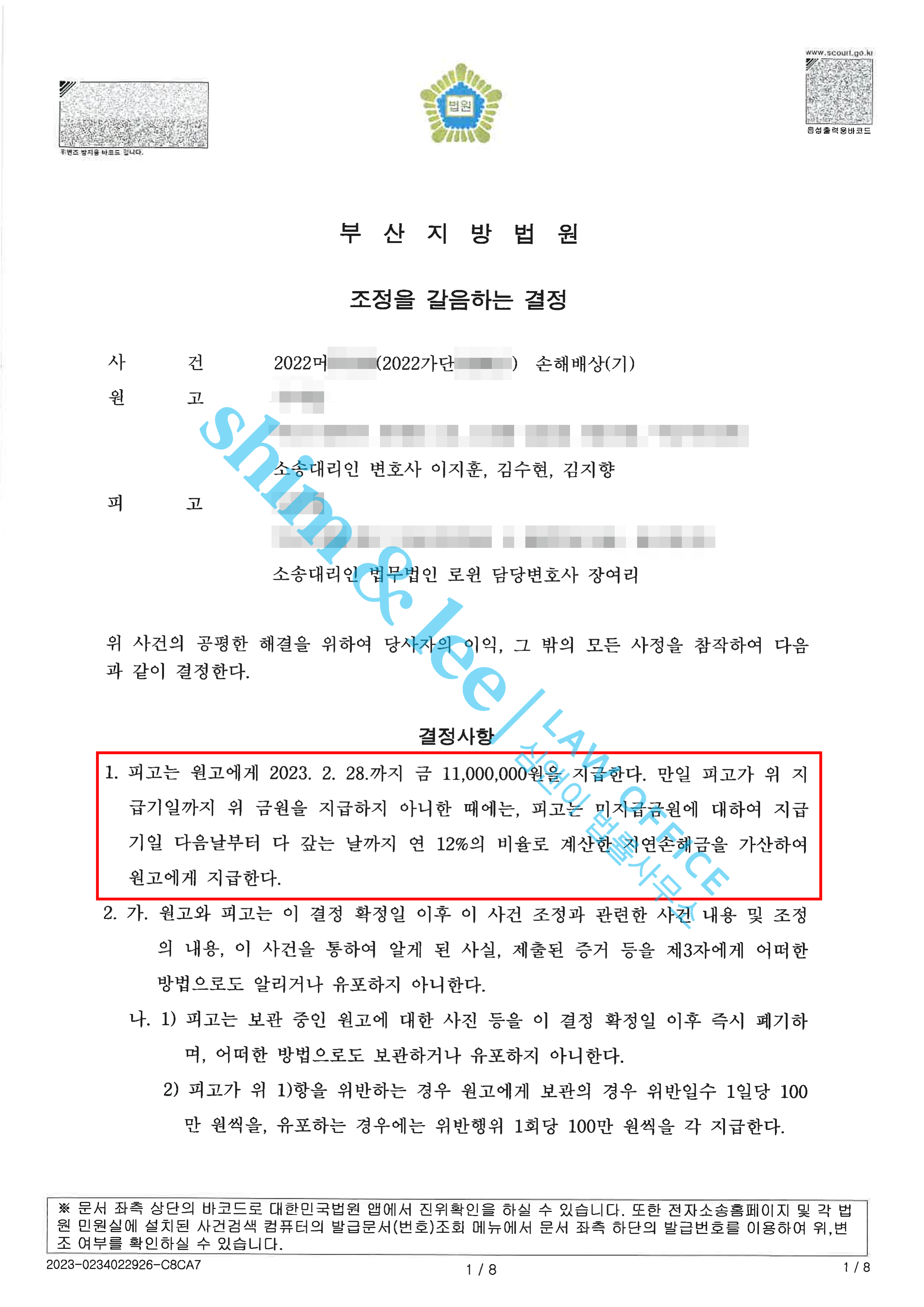 피해자를 위한 심앤이의 세심한 노력에 설득된 조정위원은 자연스럽게 피해보상액을 높이는 방향으로 조정을 이끌어주셨고, 결국 1,100만 원의 강제조정결정을 내려주셨습니다.