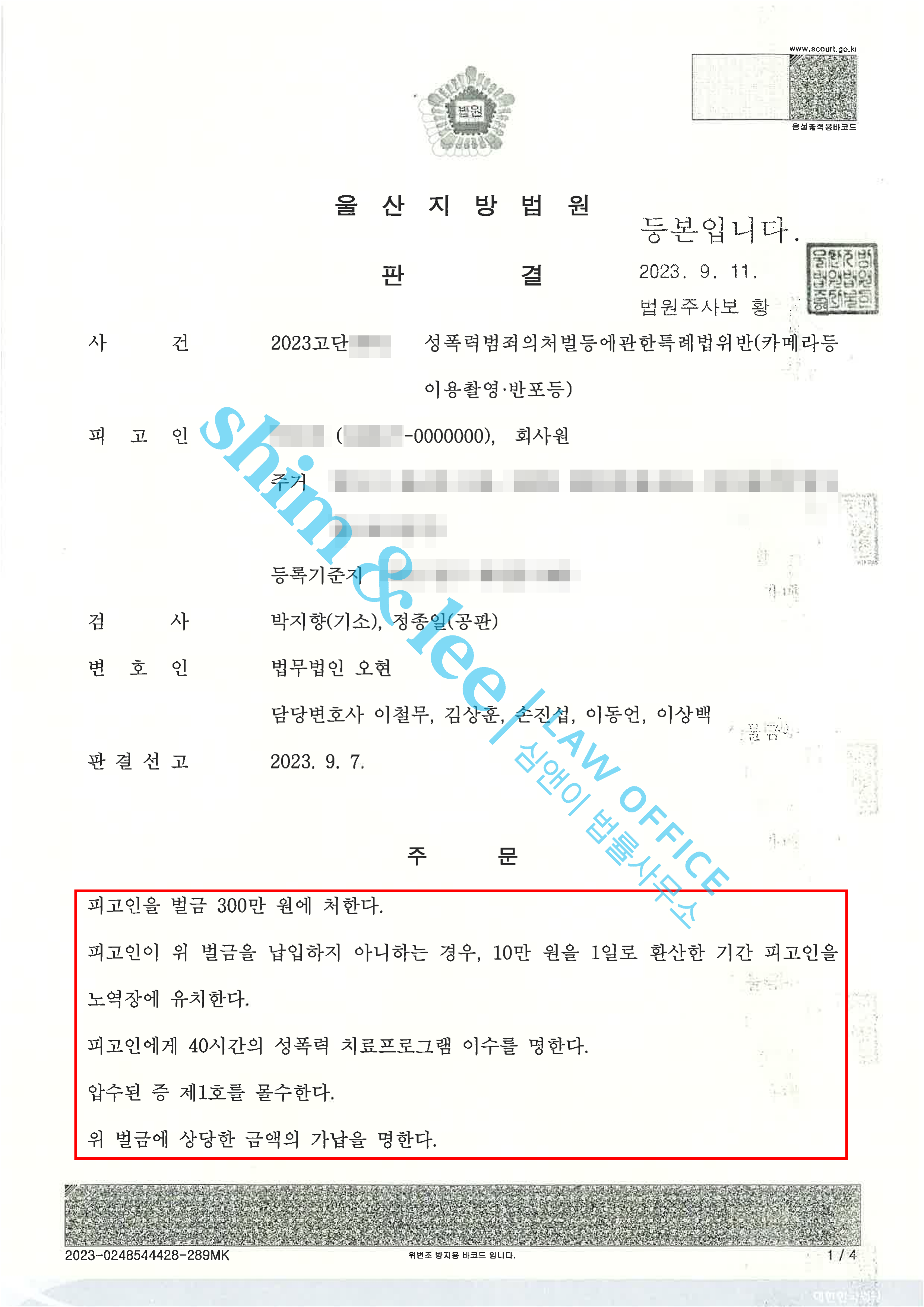 가해자는 피해자와 합의를 했음에도 벌금 300만 원, 성폭력 치료 프로그램 40시간, 핸드폰 압수라는 유죄판결을 선고받았습니다.