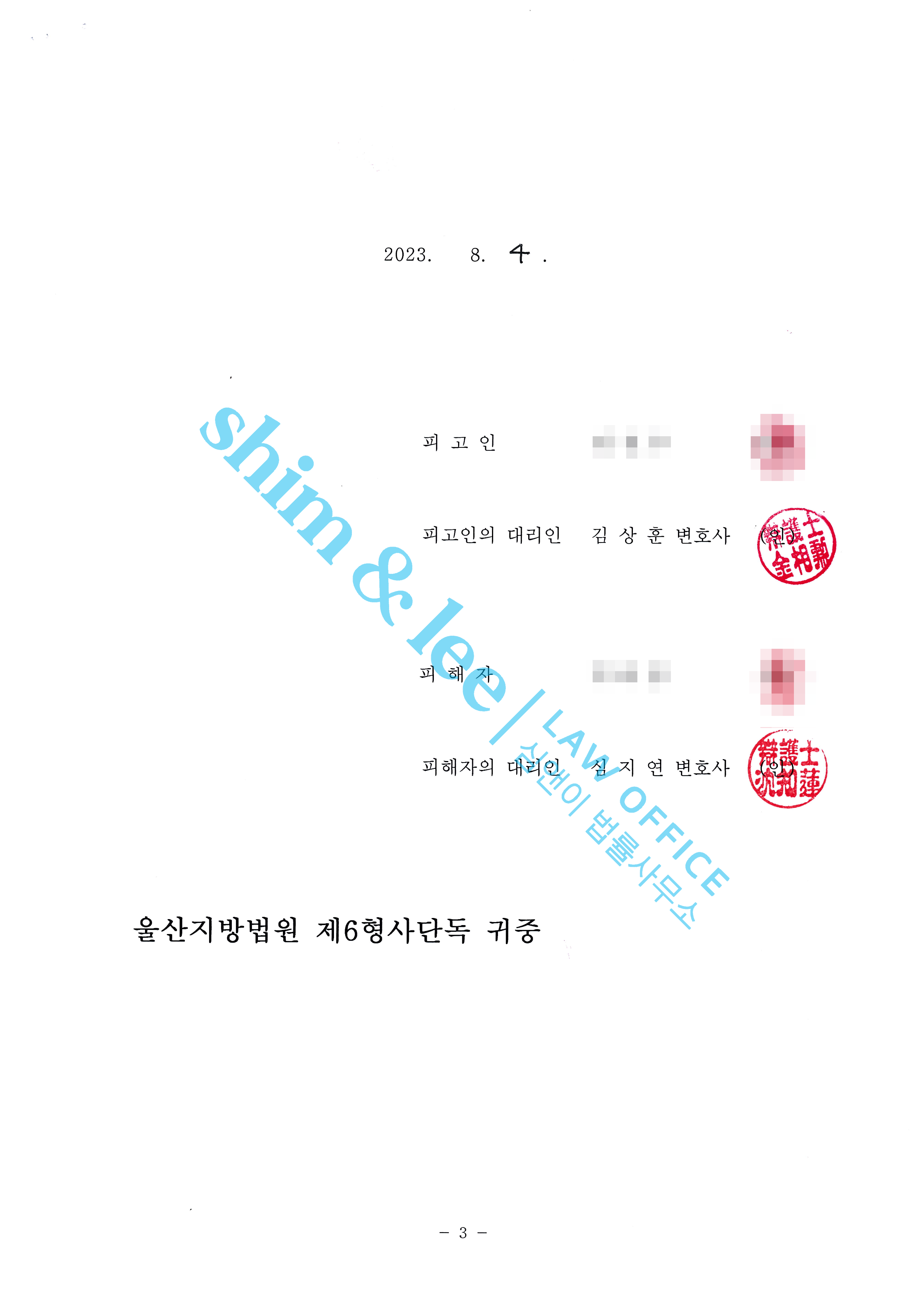 결국 합의금은 가해자측 첫 제안액에서 2배가 상향된 2,000만 원까지 높아졌고, 2차 피해가 발생하지 않도록 합의서에 다양한 피해자 보호조치를 명시하는 조건으로 안전하게 합의를 진행했습니다. -