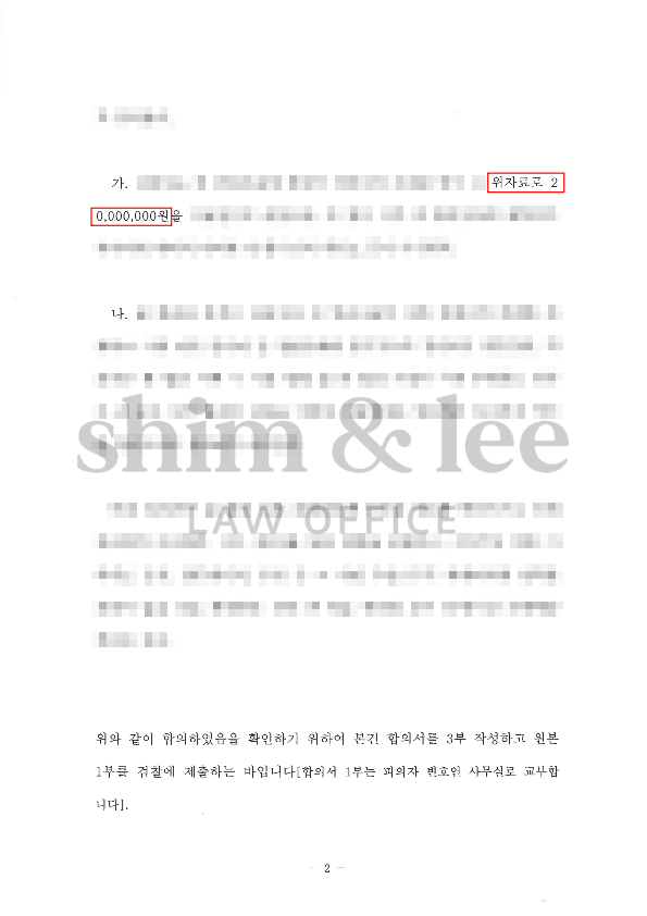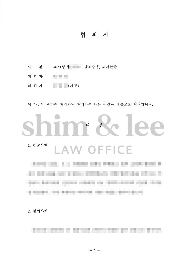 결국 가해자측의 최초 제안액 500만 원에서 2,000만 원까지 합의금을 상향시킬 수 있었고, 합의 조건으로 가해자의 범행 인정 사과문과 접근 및 연락 금지, 피해사실 유포 금지와 같은 세부사항까지 보장받는 내용의 합의서까지 작성하여 성공적으로 사건을 마무리할 수 있었습니다.