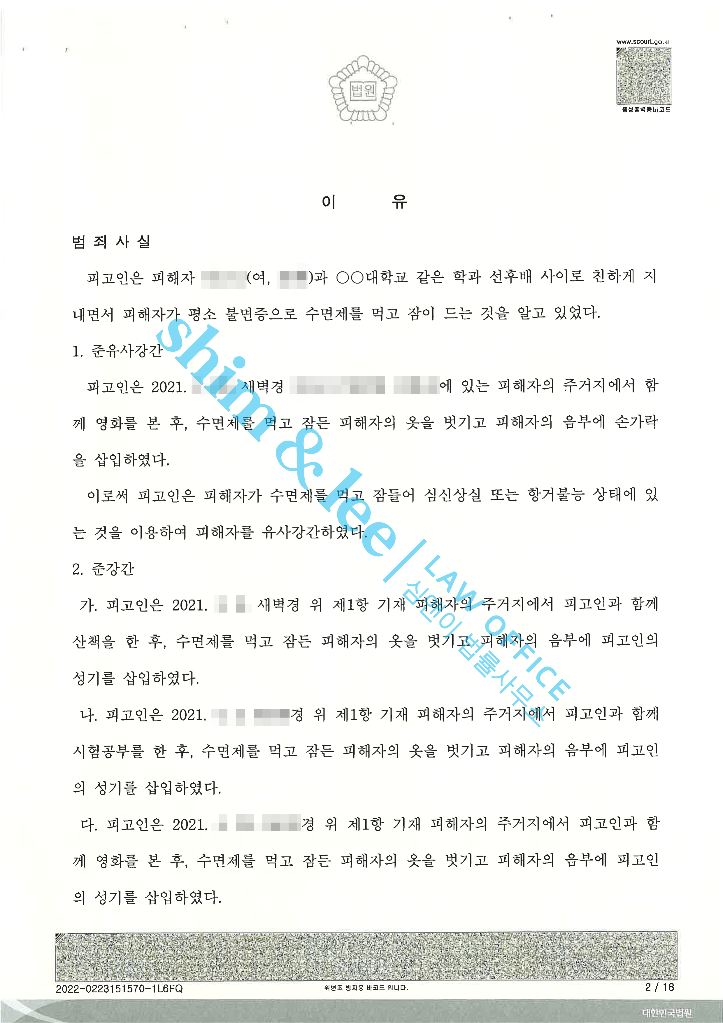 형사고소대학 선배가 모텔에서 준강간, 1년 지나서 고소 결심한 사건 2023.02.15징역 2년 / 집행유예 3년