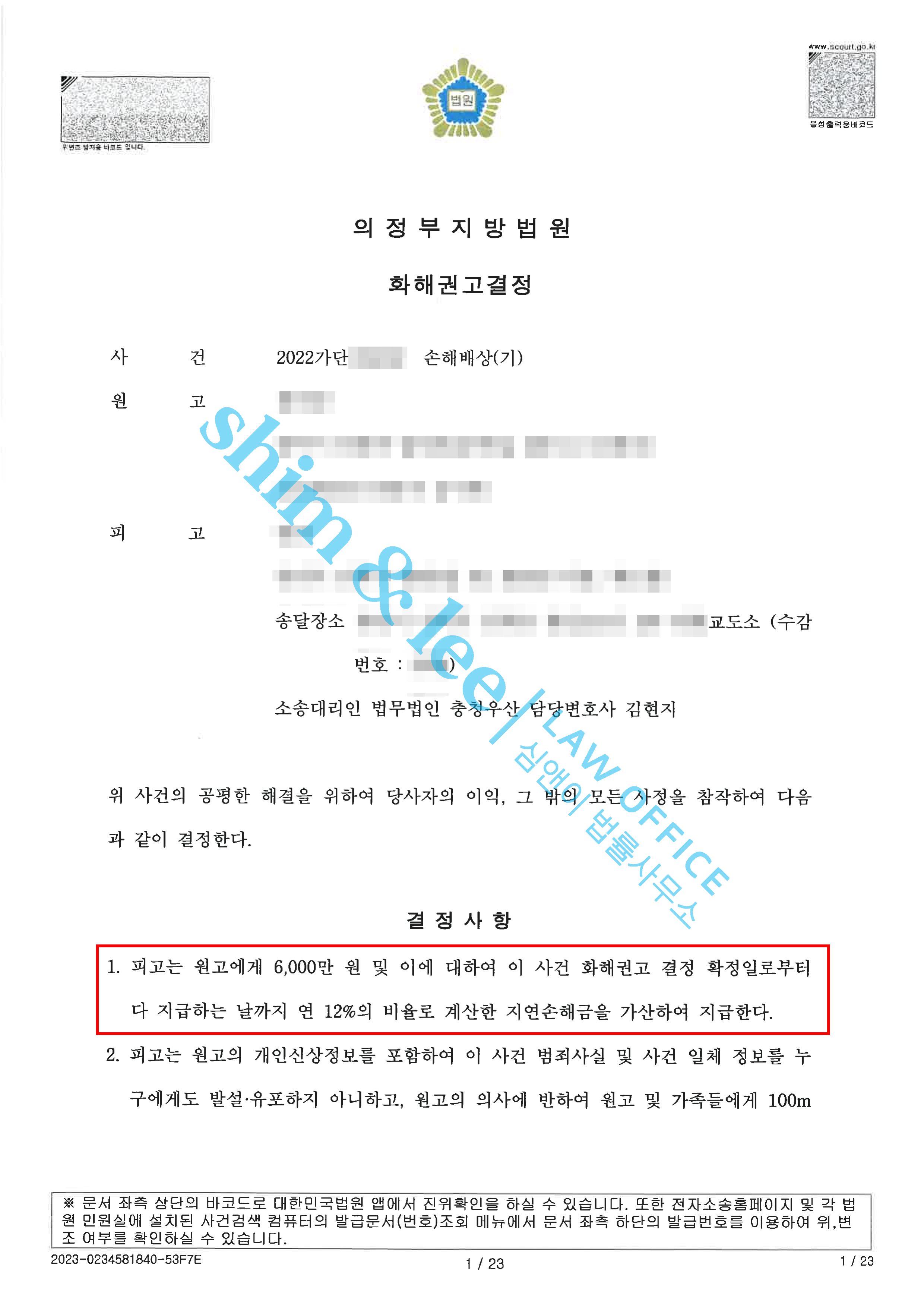 심앤이의 노력에 재판부는 유사한 사건들에서 통상적으로 인정되는 액수보다 훨씬 높은 위자료인 6,000만 원을 피해자에게 지급하라는 결정을 해주셨습니다. -