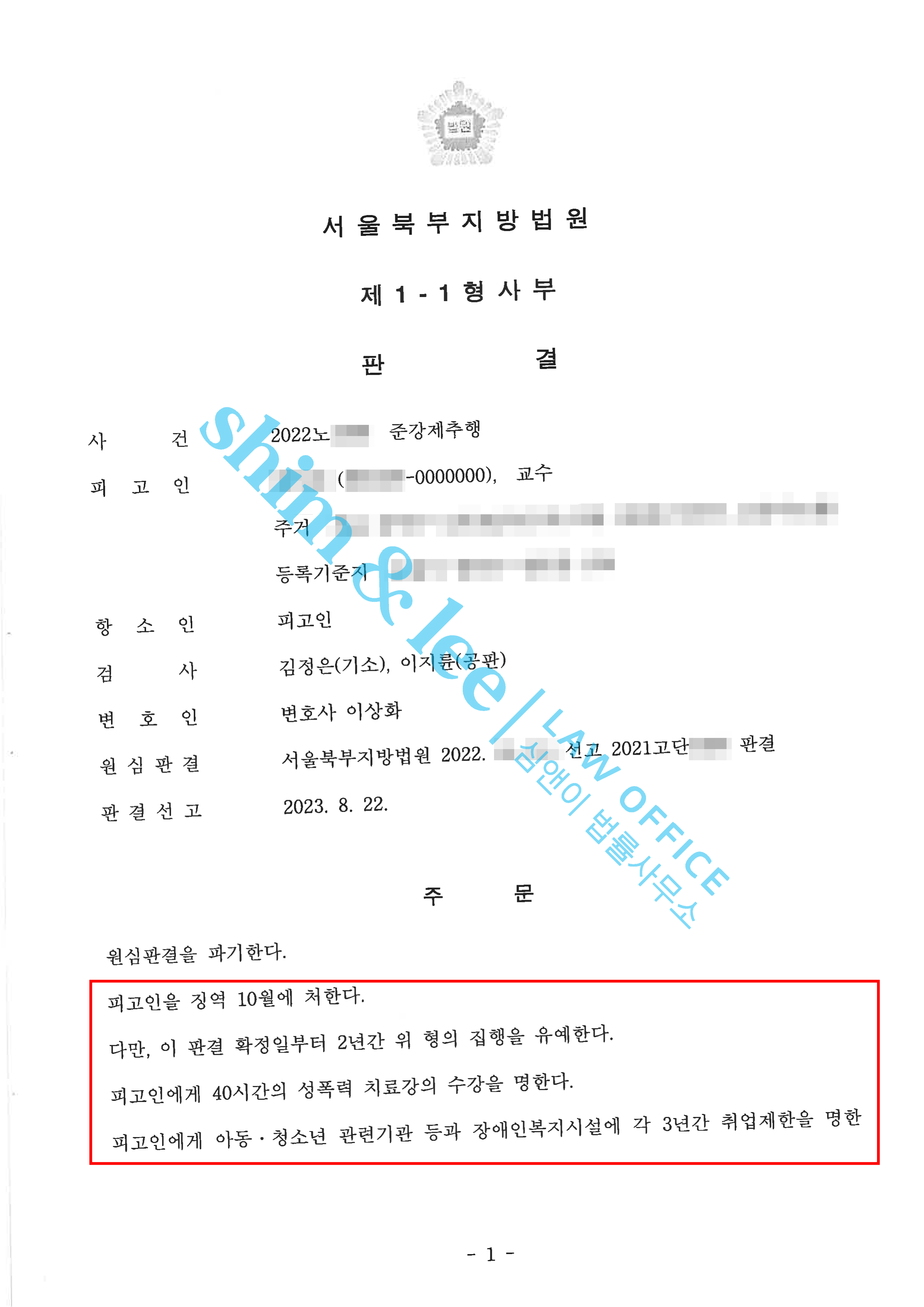 성폭력 치료강의 40시간 / 합의금 1,700만 원 -