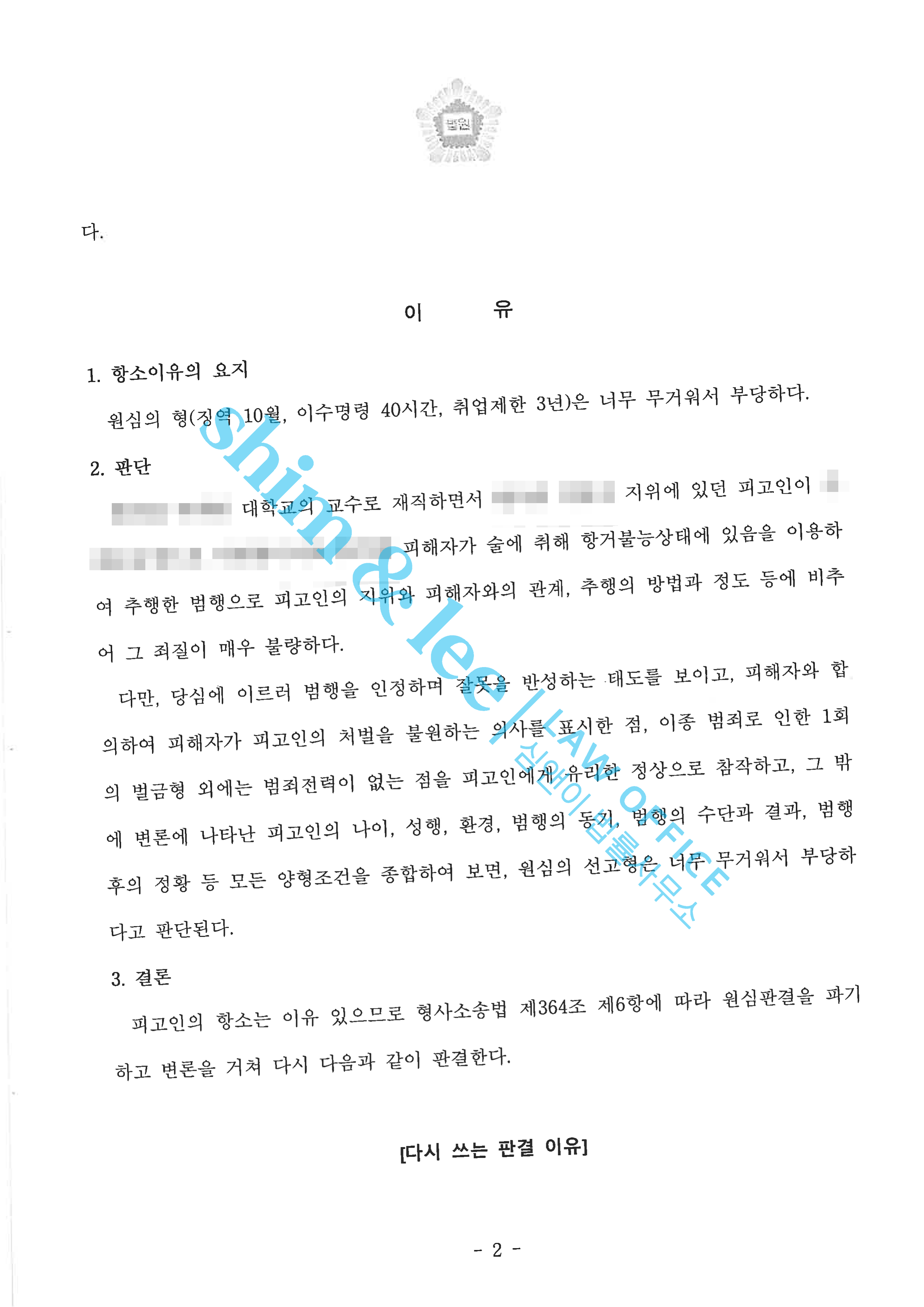 민사소송술자리에서 처음 만난 가해자가 만취한 피해자를 모텔로 데려가 강간한 사례 2022.01.11징역 3년 / 성폭력 치료강의 80시간
