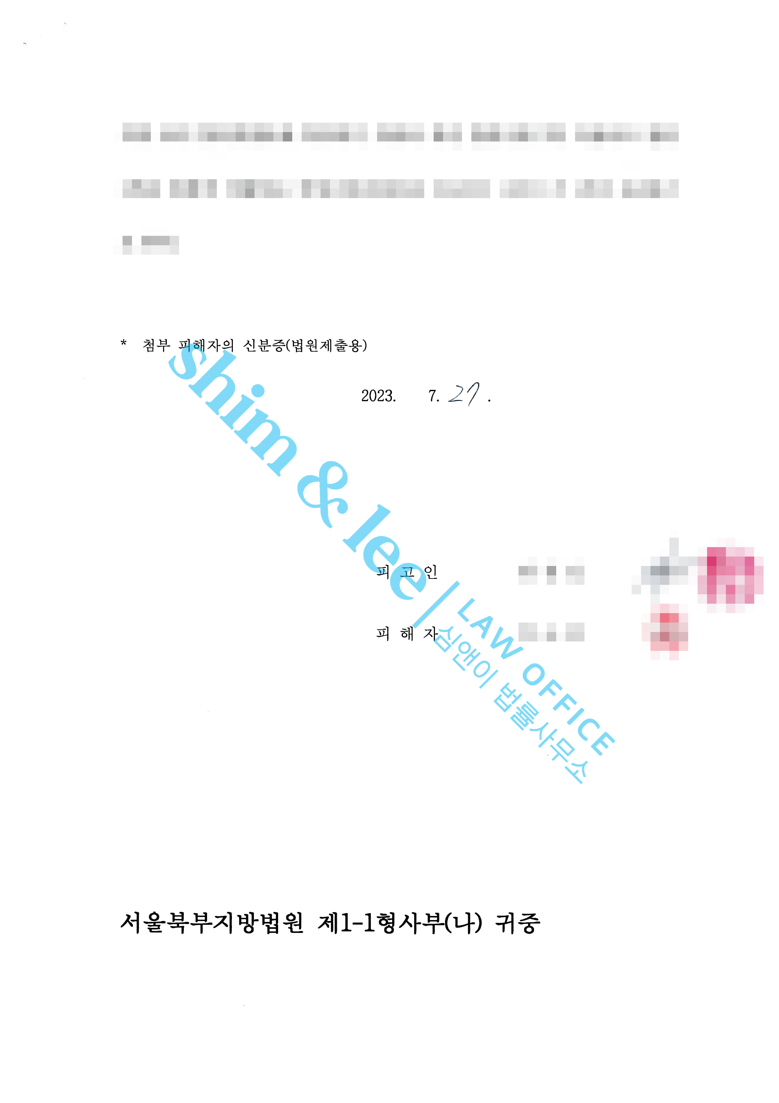 치열했던 공판 끝에 검사는 가해자에게 900만 원의 벌금을 구형했는데, 심앤이는 마지막까지 포기하지 않고 40페이지 가량의 총정리 의견서를 제출해 가해자의 악질적인 범행수법을 호소하며 사건을 면밀히 검토해주실 것을 부탁드렸습니다. 결국 검사의 벌금형 구형에도 불구하고 이례적으로 징역 10월의 실형이 선고되었고, 가해자는 법정에서 구속되었습니다.