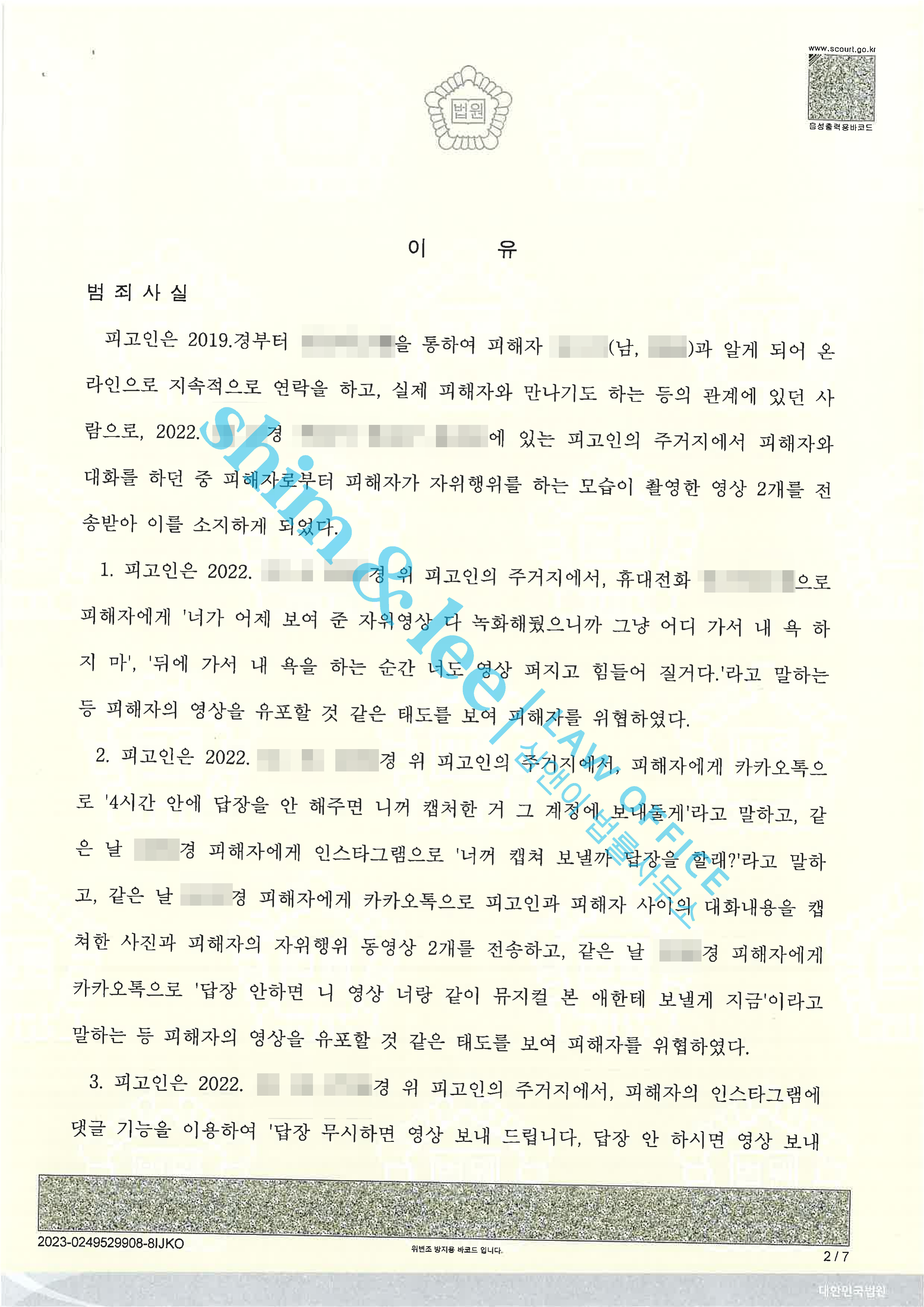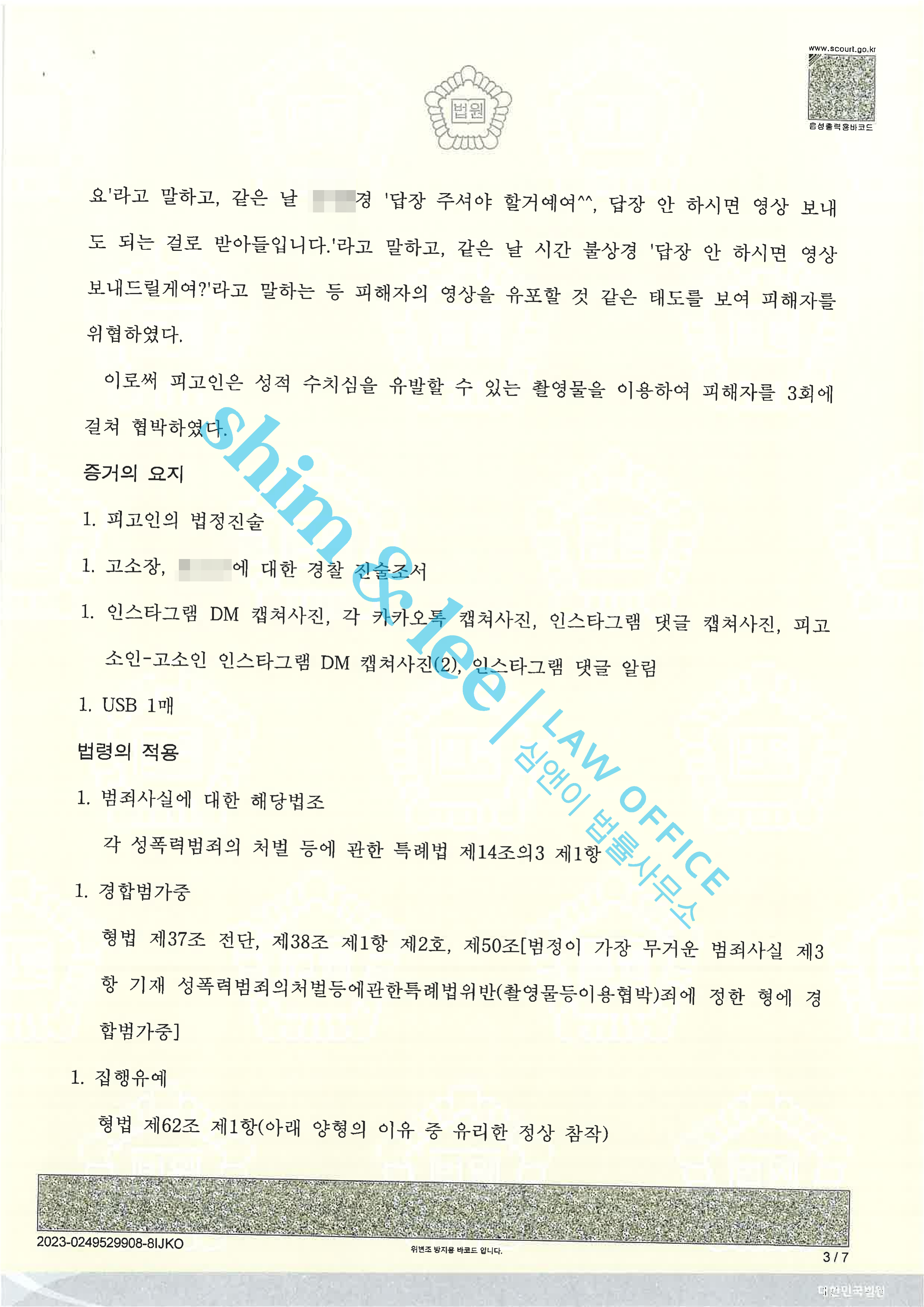 - 자위영상과 캡쳐본을 피해자의 팔로워 지인들에게 뿌리겠다며 약 10일에 걸쳐서 불법촬영물을 이용한 협박