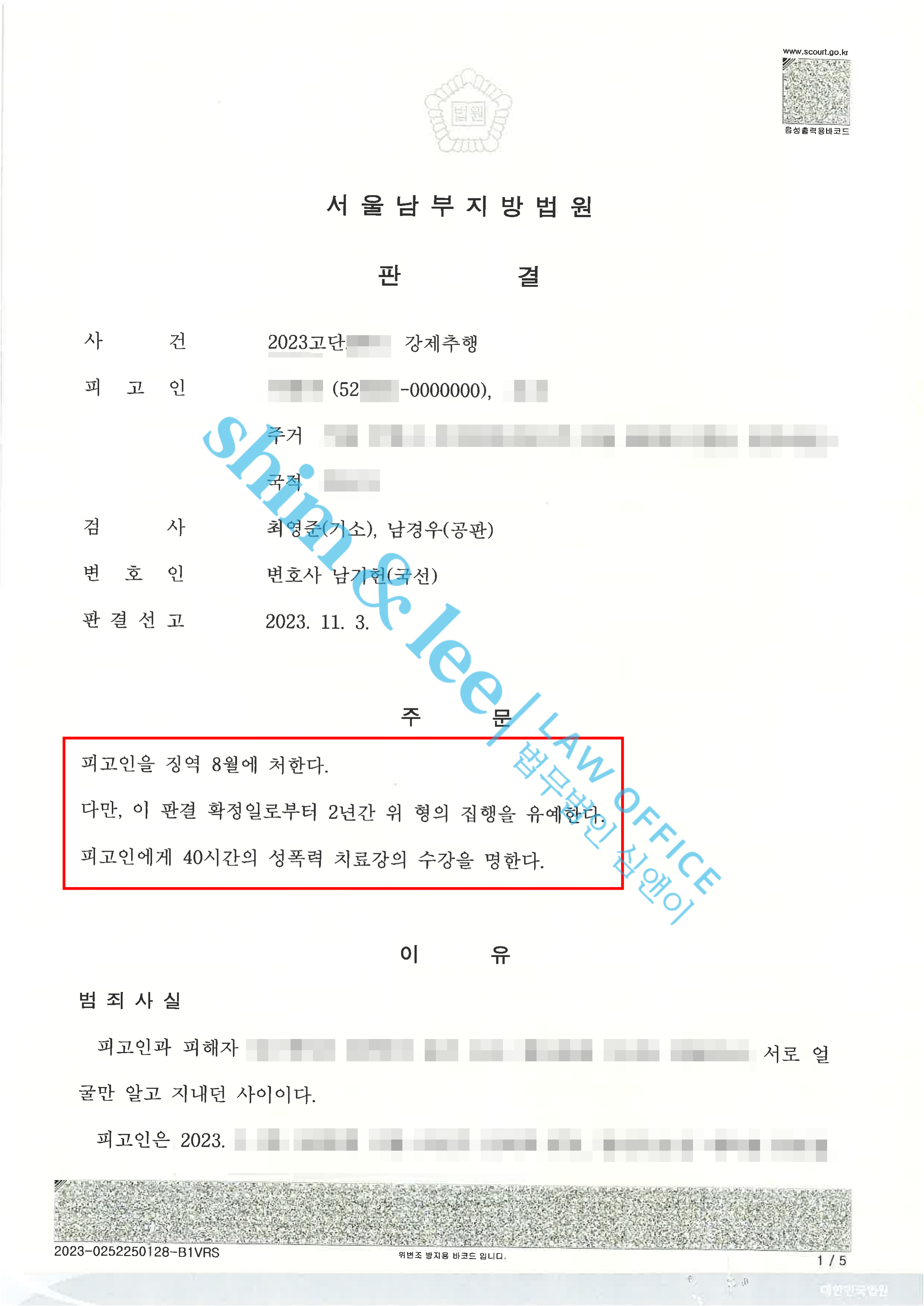 - 심앤이의 간곡한 호소에 가해자는 재판을 받게 되었고, 재판 진행 과정에서 압박감을 느낀 가해자는 자신의 국선 변호사를 통해 정식으로 합의를 제안해옴