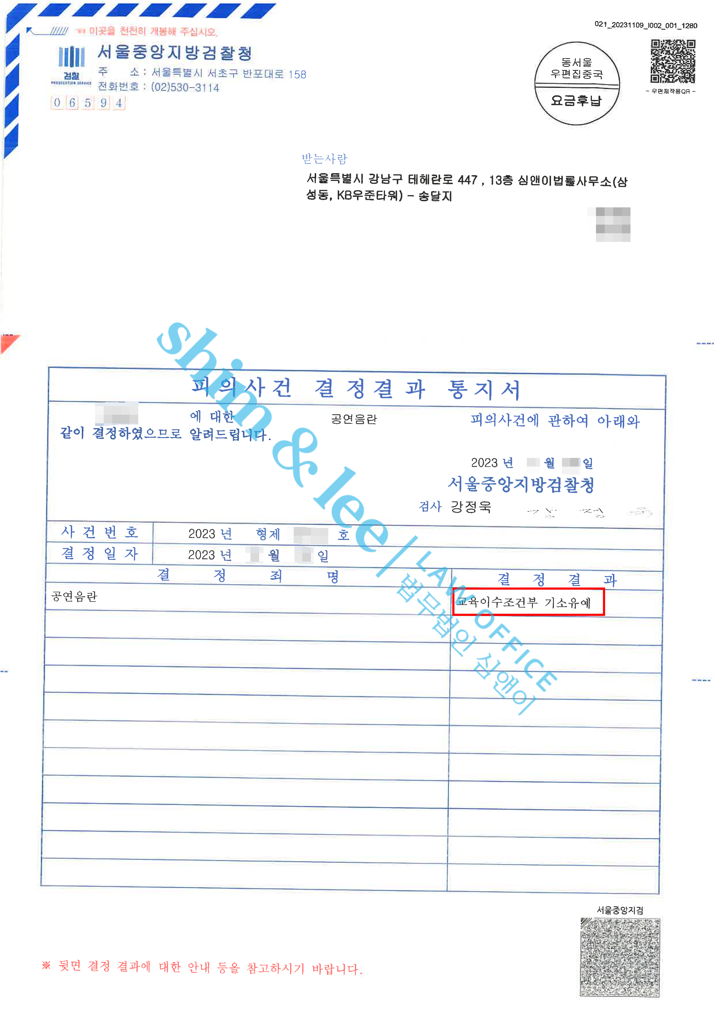 - 다만 공연음란의 고의까지 인정하기에는 억울한 부분이 많은 만큼 고의성이 없어 공연음란 성립하지는 않는다는 방향으로 의견서를 제출하고, 피해자의 행위가 타인에게 불쾌감을 주었다면 그 부분에 대하여는 반성한다는 태도로 검사님을 설득함 -