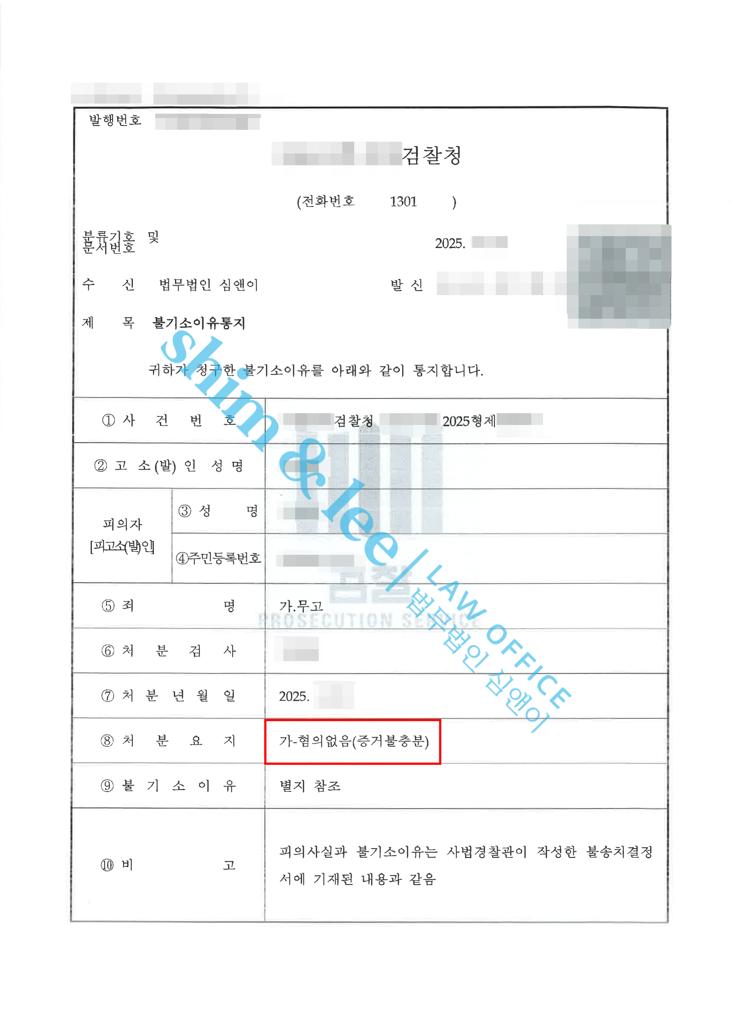 - 경찰 및 검찰의 수사 끝에 의뢰인은 허위의 사실을 통해 의도적으로 가해자를 처벌하고자 신고한 것이 아님을 입증 받아 최종적으로 무고죄 혐의 없음으로 불기소 결정을 받았습니다.
