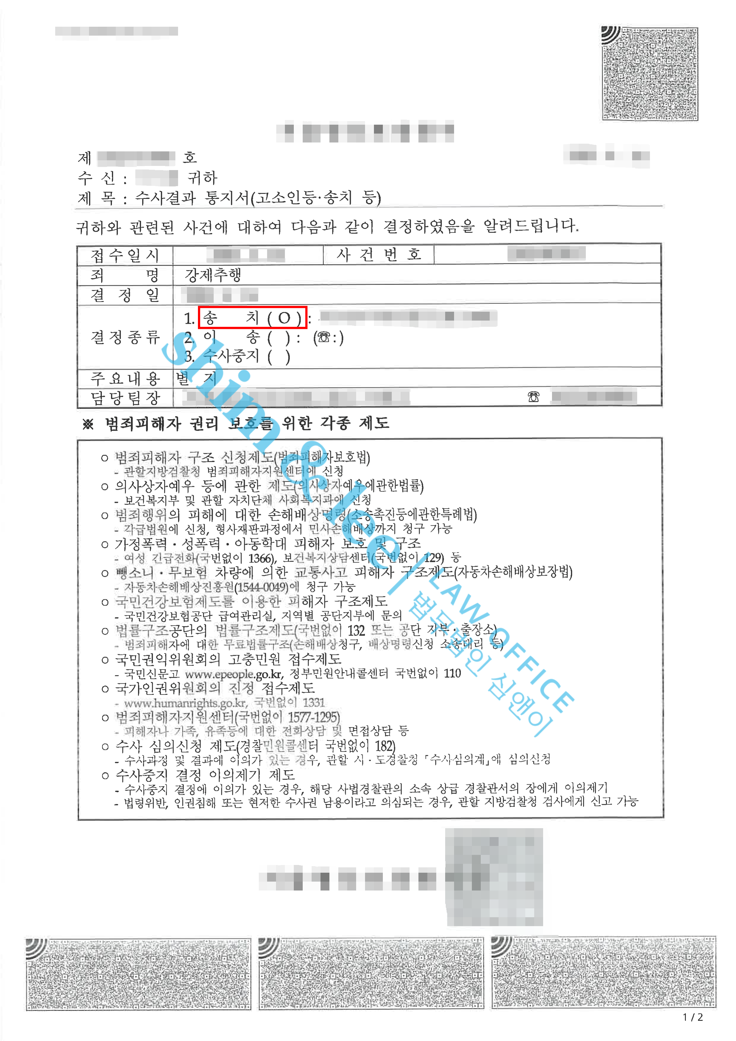 - 가해자는 경찰 조사에서 자신의 행위가 단순한 반가움의 표현이었을 뿐 추행의 고의는 전혀 없었다며 혐의를 끝까지 부인하였습니다. 그러나 피해 장면이 담긴 CCTV 영상과 담당 변호사님이 제출한 서면을 통해 가해자의 강제추행 혐의가 인정되었고, 사건은 결국 검찰에 송치되었습니다.
