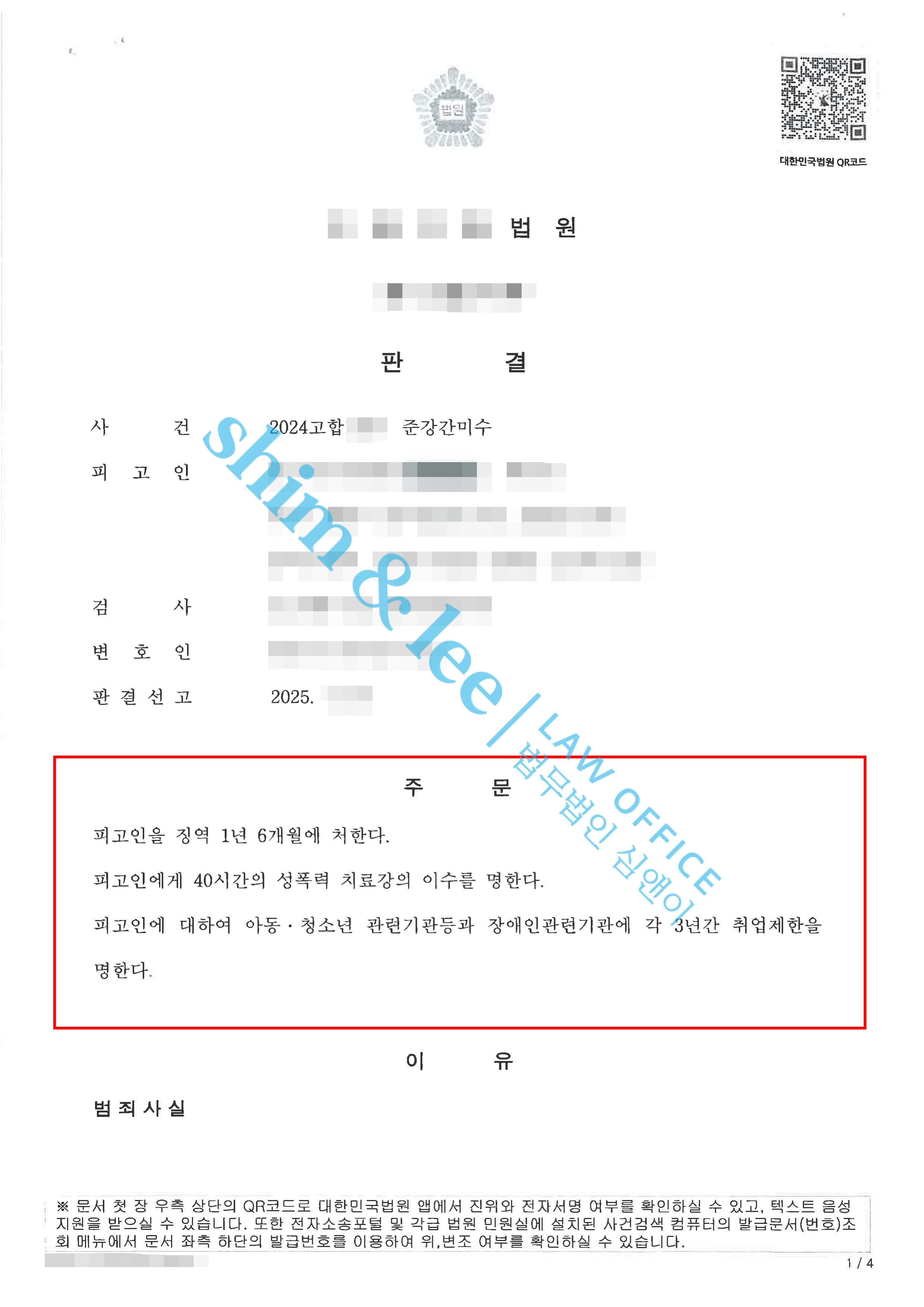 - 재판부는 제출된 증거들을 검토한 결과 가해자의 혐의가 유죄로 인정된다며 징역 1년 6개월, 성폭력 치료강의 40시간, 취업제한 4년의 실형을 선고하였습니다. 특히, 선고기일에 재판부는 가해자가 피해자로부터 용서받지 못한 점을 지적하며 실형을 선고한 이유를 밝혔습니다.