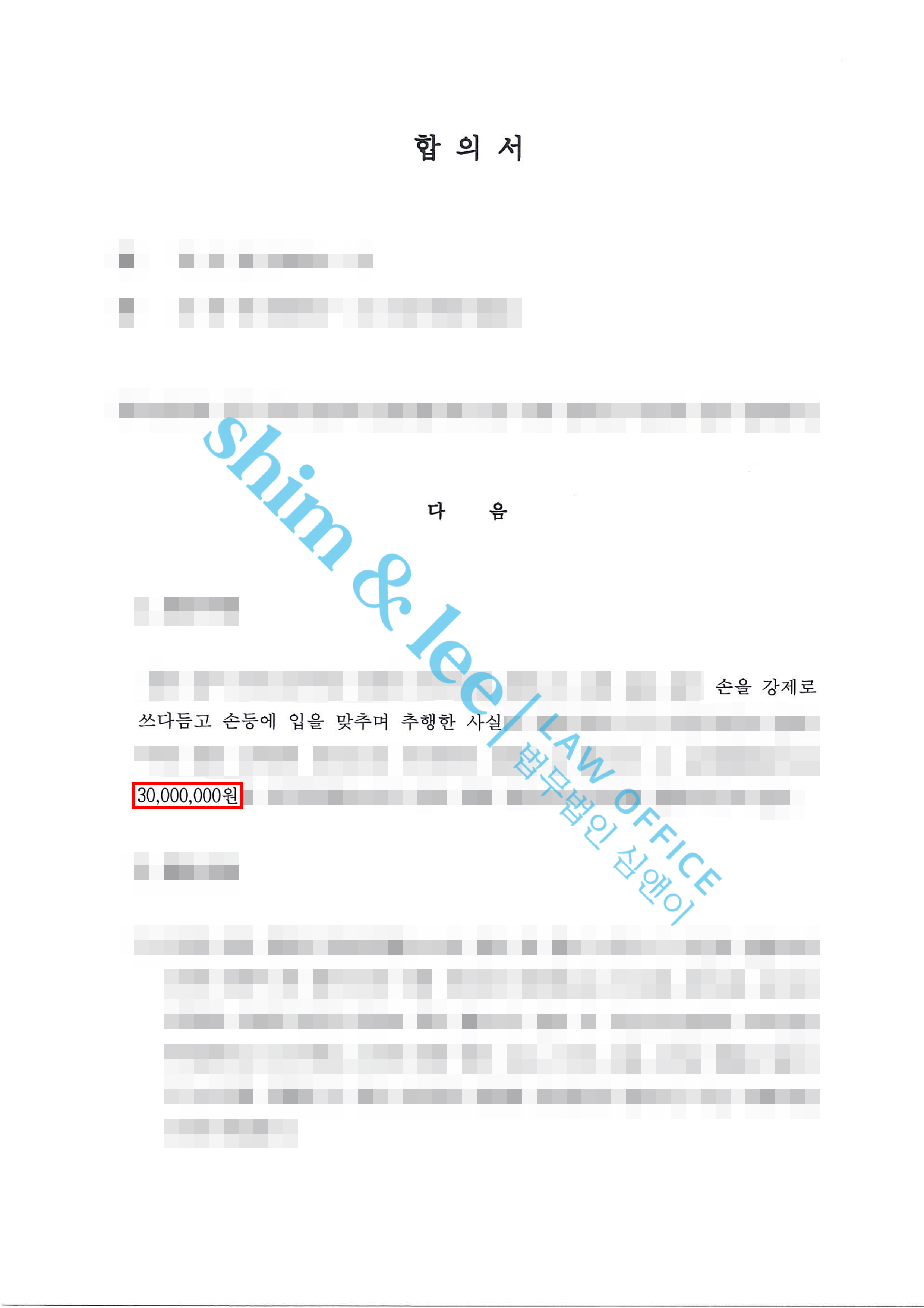 - 대표 변호사님의 단호한 태도에 합의가 결렬되고 자신의 범행이 회사에 알려질까 우려한 가해자는 최종적으로 합의금 3천만 원을 제안하고, 의뢰인이 정당하게 실업급여를 수령할 수 있도록 권고사직 처리하겠다고 하여 극적으로 합의가 이루어졌습니다. 이 밖에도 합의서에는 비밀유지, 접근금지 통신제한 등 의뢰인에게 유리한 조항을 추가하여 합의를 진행하였습니다.